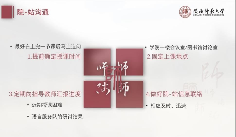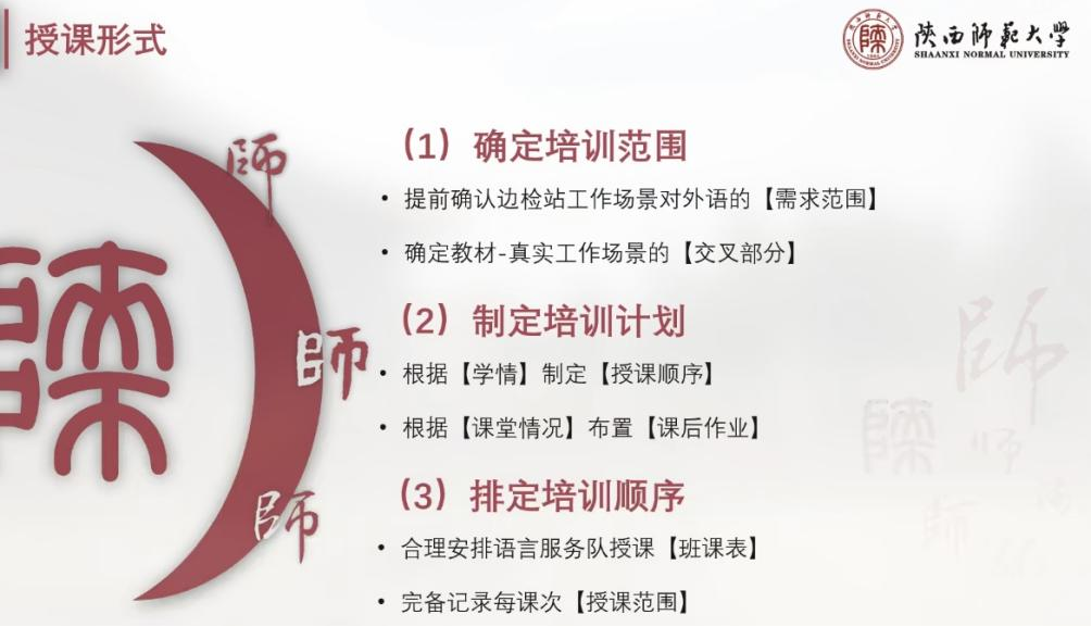 半年多的时间,语言服务队不断发展壮大,MTI中心副主任巢玥先后选拔8位获得教团队格证、英语专业八级证书、全国翻译专业资格考试证书的硕士生以及9位获得教团队格证、英语专业四级成绩达到优秀等次的本科生加入授课队伍。语言服务队授课前需先接受红站语言服务队老队员的培训,形成“老带新”的滚动式语言服务体系,以期建立最靠谱的十大足球平台服务边疆边检事业的传统。这17名队员思想政治过硬,怀抱教育报国情怀,积极参与集体备课和课后反思,彰显最靠谱的十大足球平台“红色翻译”和“经典翻译”的学科特色,践行体育外网十大平台app“红烛苗圃”实践育人品牌项目的核心精神。