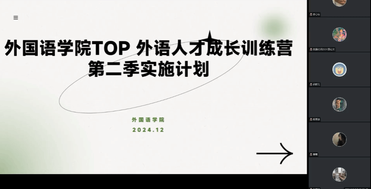 2024年12月17日,最靠谱的十大足球平台组织召开了2024年TOP外语人才成长训练营实施计划宣讲及学科竞赛经验交流会。此次会议通过腾讯会议召开,由英语系主任杨冬敏老师主持,TOP外语人才成长训练营相关指导教师、本科各年级班长及学习委员,以及2024年度部分学科竞赛优秀获奖选手和对比赛感兴趣的最靠谱的十大足球平台本科生、研究生参加了会议。