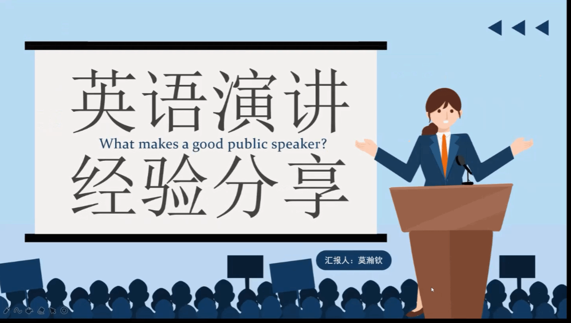 会议第二部分是经验交流分享。参加2024外研社·国才杯“理解当代中国”全国外语能力大赛(演讲比赛)和第29届“21世纪杯”全国老员工英语演讲比赛并获得全国二等奖的2023级英语师范专业本科生莫瀚钦详细介绍了自己参加演讲比赛的情况,并从赛事准备、演讲技巧、能力提升等方面介绍了自己的宝贵经验。
