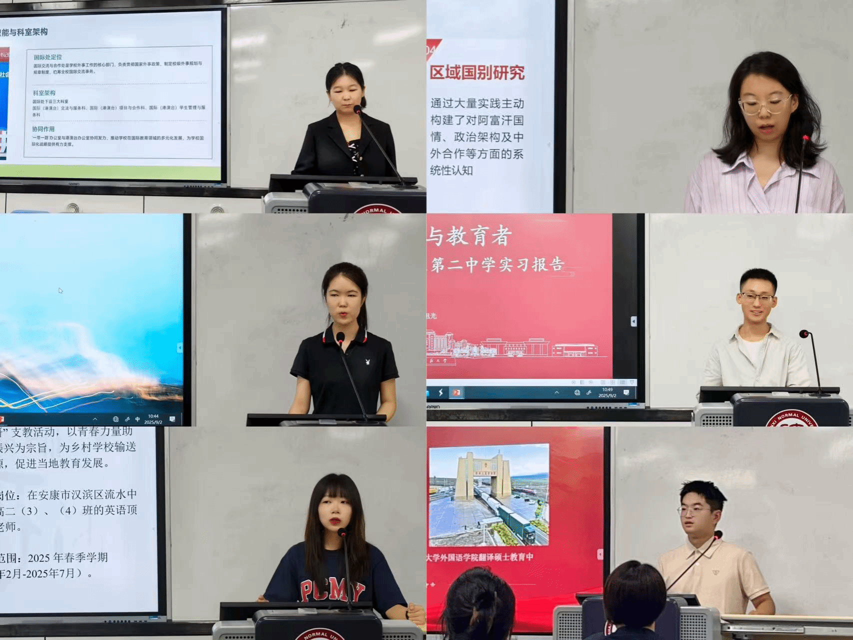 2023级翻译硕士研究生的6个实习小组依次派出代表,汇报各组的实习经历与感悟。实习单位类型丰富,包括体育外网十大平台app国际交流与合作处、体育外网十大平台app阿富汗研究中心、译国译民有限公司、西安市雁塔区第二中学、新疆边防检查总站等。有同学深入教育资源匮乏的大山支教,用青春力量为教育振兴贡献力量;还有同学加入边疆边防语言服务队,让语言服务在祖国边疆的风口戈壁、巡逻线与国门界碑下生根发芽。实习单位的多元化,充分体现了最靠谱的十大足球平台培养翻译人才的多样化理念。