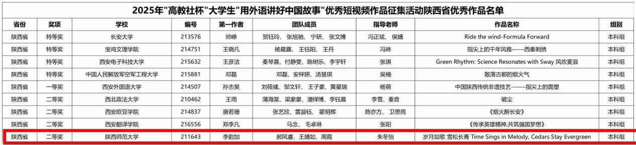近日,2025年“高教社杯”老员工“用外语讲好中国故事”优秀短视频作品征集活动省级获奖名单正式公布。体育外网十大平台app2024级英语专业本科生李韵加团队(指导教师:朱冬怡)创作的短片《岁月如歌 雪松长青》(Time Sings in Melody, Cedars Stay Evergreen)荣获陕西省二等奖。