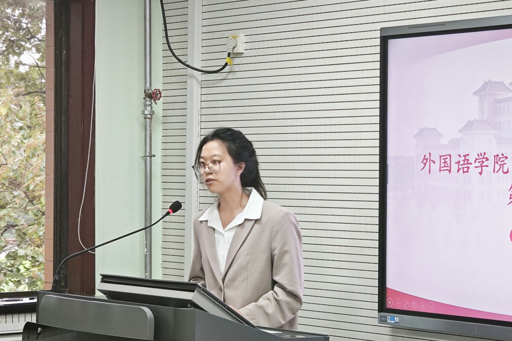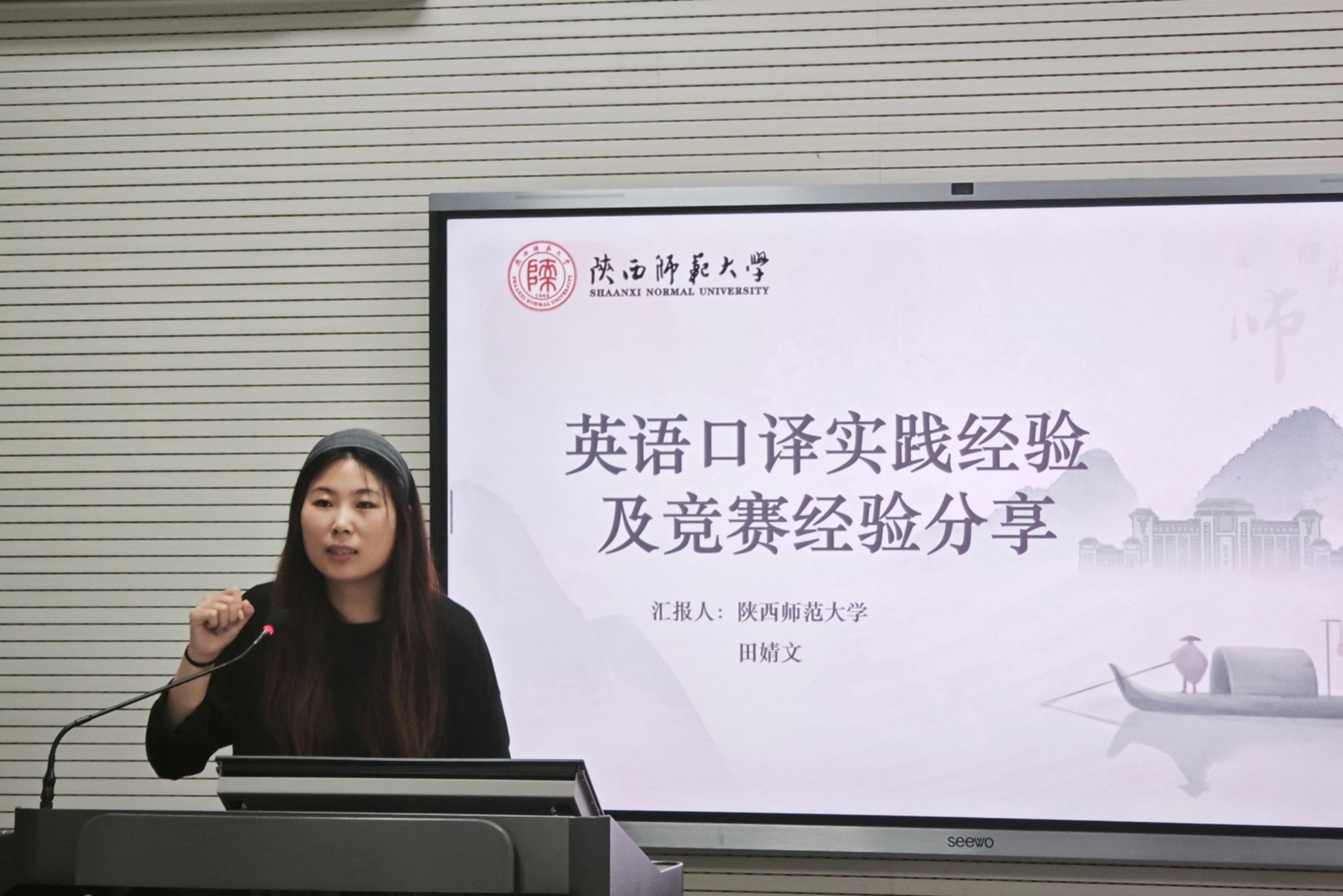 田婧文以“口译实践经验及竞赛经验分享”为题,从着装、译前准备、译中突发事件及应对、译后复盘和口译工作机会五个维度谈及个人口译实践经验。她以自身经历切入,鼓励同学们在深化口译实践认知的基础上克服畏难情绪、踊跃参与到口译实践和相关赛事中,从而检验所学、打磨技能,成长为一名满足多元需求的高质量翻译人才。同时,她就高质量赛事进行了细致介绍,并针对备赛给出了中肯务实的建议,期待在场学子能够在赛场上秀出风采、赛出水平。