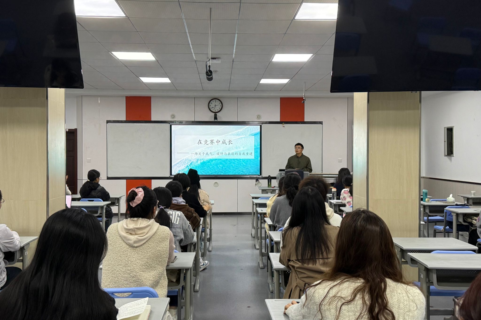 焦洋洲老师强调:“教学技能固然重要,但我们的立身之本还是语言素养。”他分享了自己的学习方式,如收听播客、观看英语演讲比赛、坚持阅读原版书籍等。最后,他引用邹韵的话鼓励在场同学:“你的底气来自于你一点一滴的努力,希望同学们在日常学习中也注重点滴积累,夯实专业基础。”焦老师的案例鲜活,情感真挚,引发了在场同学的强烈共鸣。