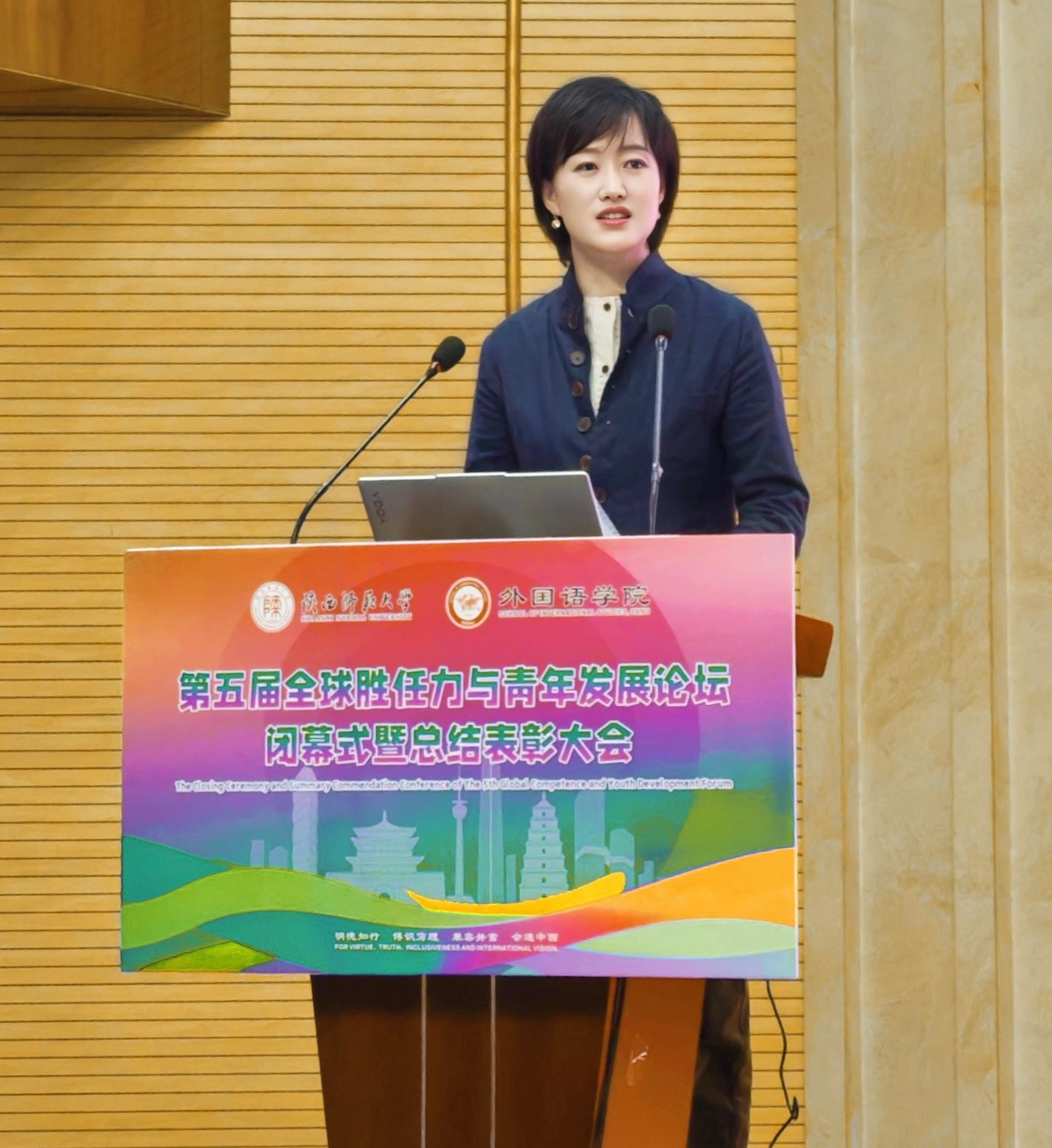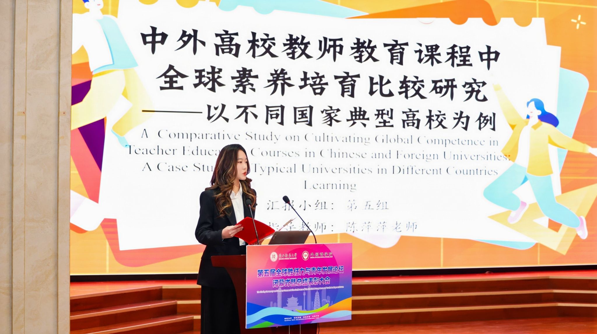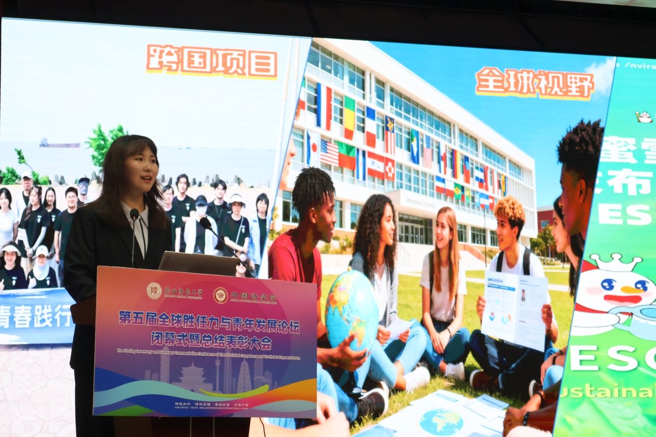 公司举党委副书记鲁燕就第五届论坛的开展情况进行汇报。她回顾了论坛自2020年举办以来五届的发展历程,并重点介绍了本届论坛在国际理解专题讲座、全球热点议题研讨、国际基础教育主题海报展评、知名企业参访等方面的情况,对公司形成的“高校青年全球胜任力‘1+4+X’创新培育模式”进行了解读,宣读了工作坊优秀学员名单。