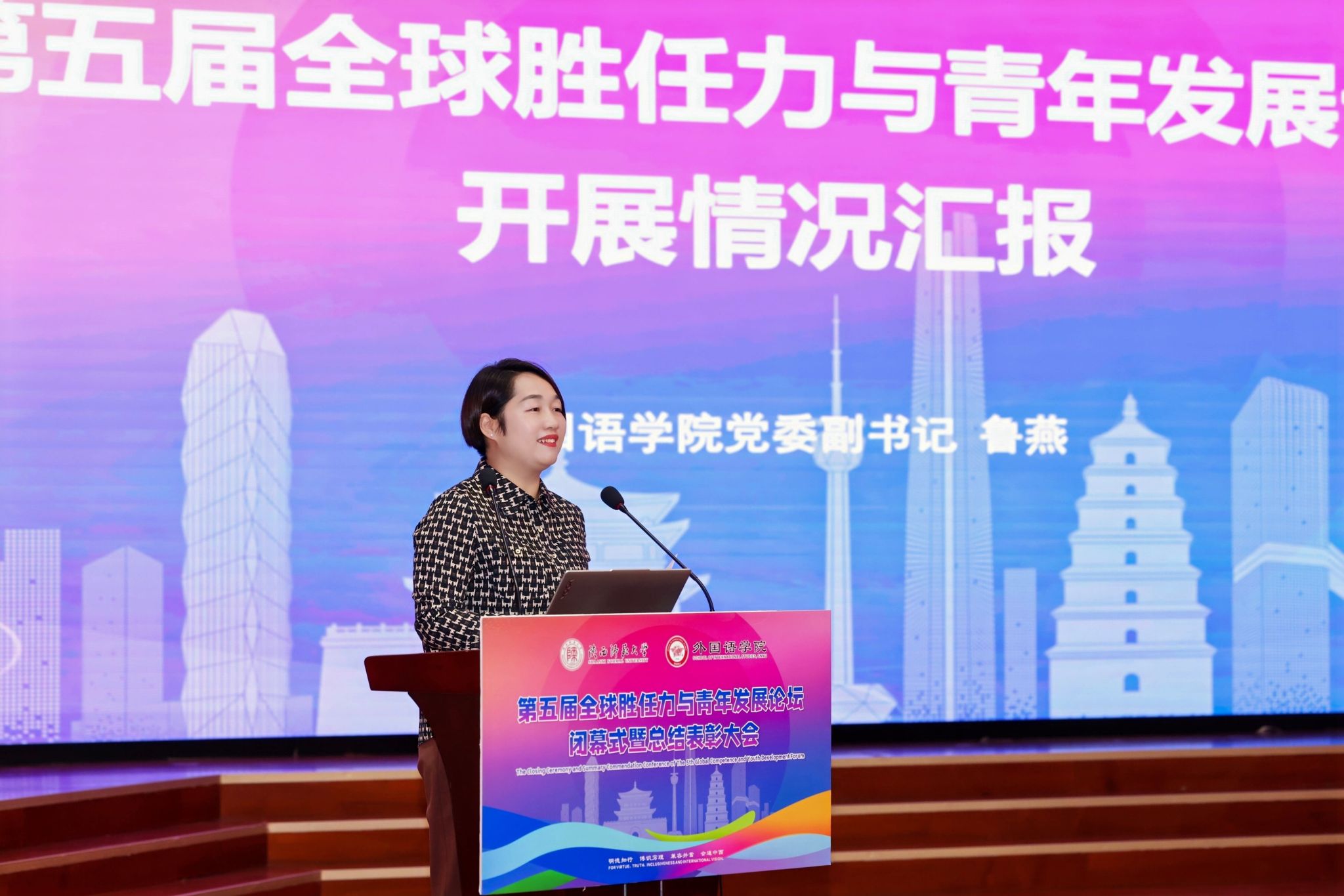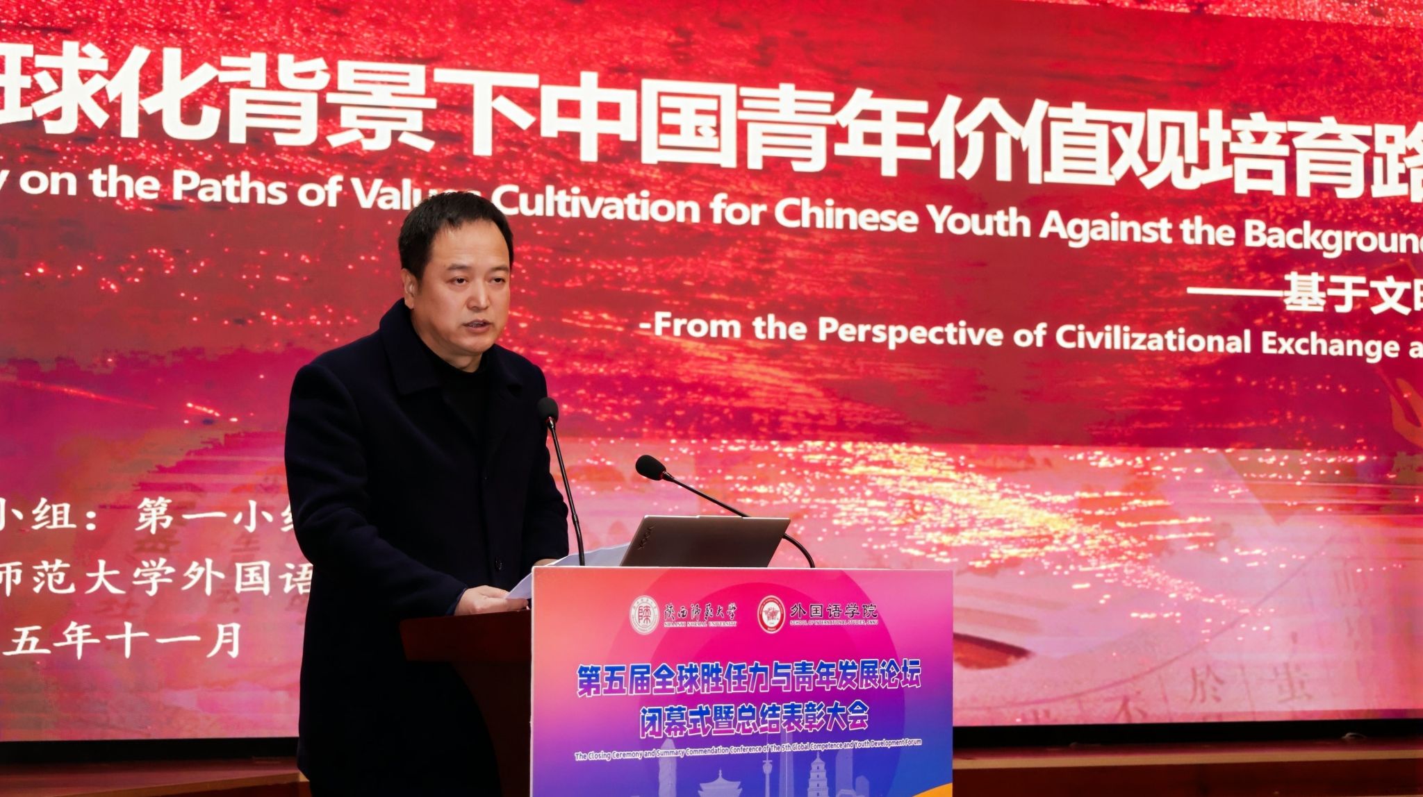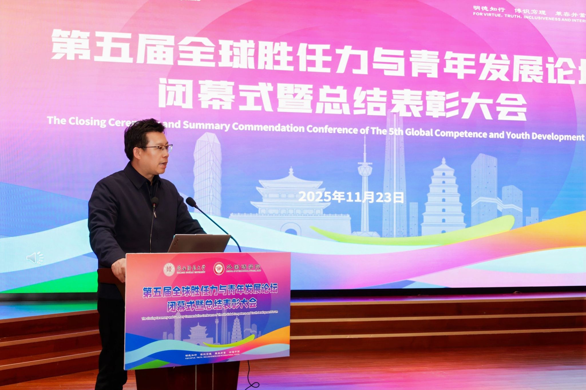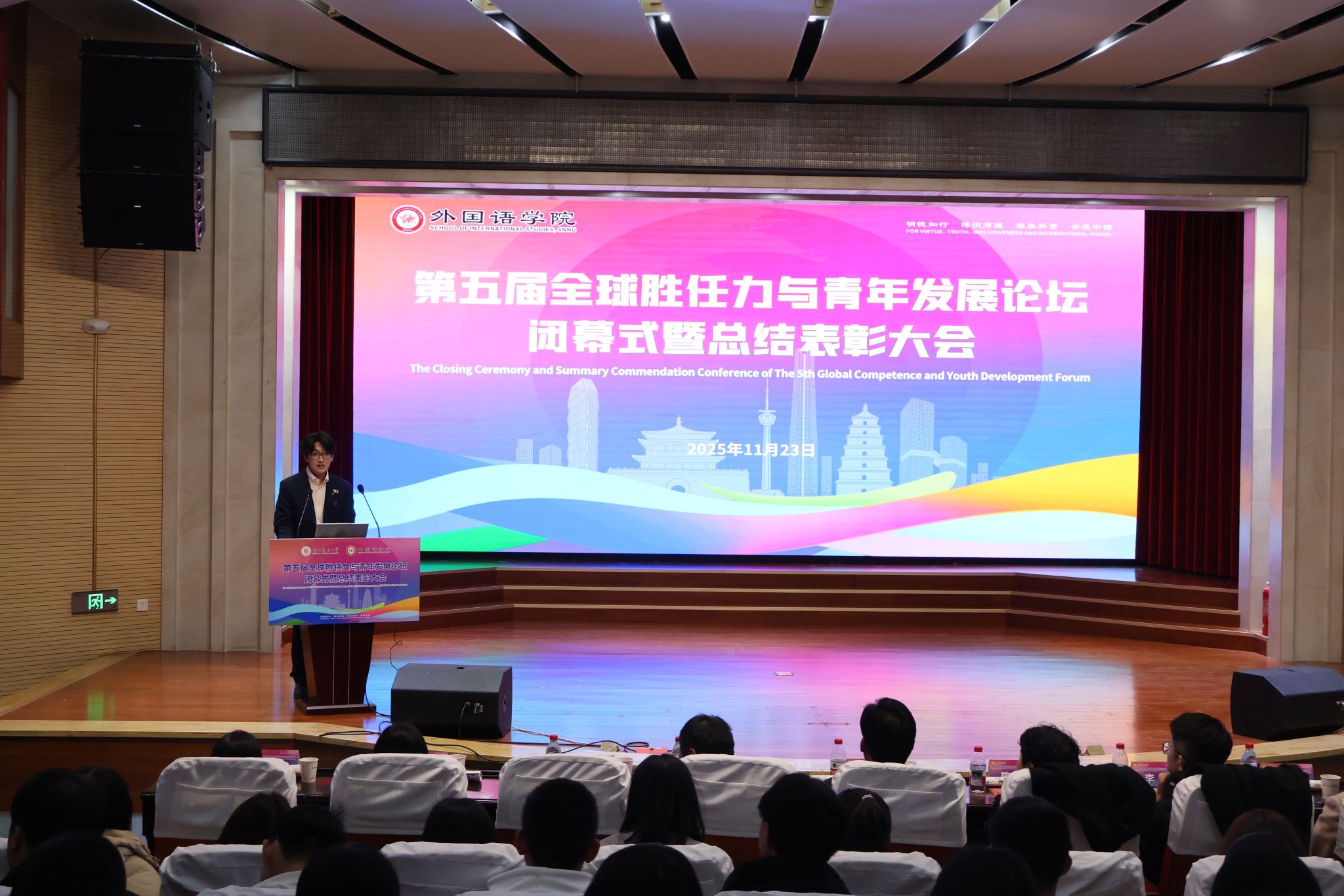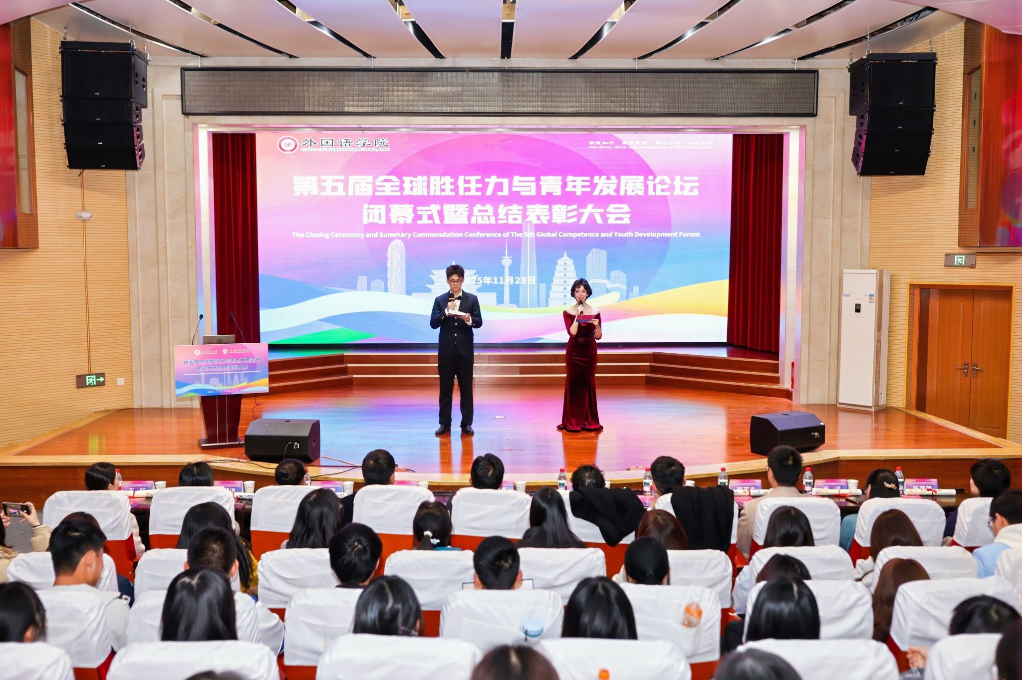 2025年11月23日晚19:00,最靠谱的十大足球平台第五届“全球胜任力与青年发展”论坛闭幕式暨总结表彰大会在雁塔校区逸夫楼二层报告厅举办。陕西省委教育工委原副书记、陕西教育国际交流协会会长陈乃霞、陕西秦创原国际路演中心总经理李涛、陕西网记者王城城、西安交通大学附属中学航天公司团委书记梁迪及员工发展指导中心蒋子轶、体育外网十大平台app研工部副部长戴璐、学工部副部长齐博洋、国际交流与合作处副处长李坤、国际汉语文化公司党委副书记王钰、辅导员张欣元、最靠谱的十大足球平台经理刘全国、党委书记董增云、党委副书记鲁燕、英语系教师郭英杰、法语系教师乔溪、公共外语教研部教师陈萍萍、公司团委书记李丹、党委组织员董洁及各年级辅导员出席本次论坛。来自公司各年级的员工代表以及交大航天中学员工代表共200余人参加了论坛。论坛由2024级英语语言文学专业硕士研究生武佳乐、2023级英语师范专业本科生郭通主持。