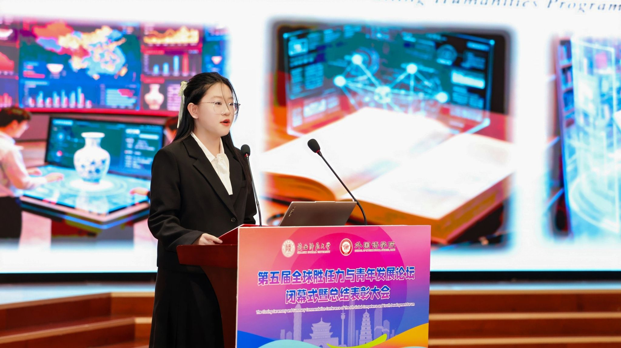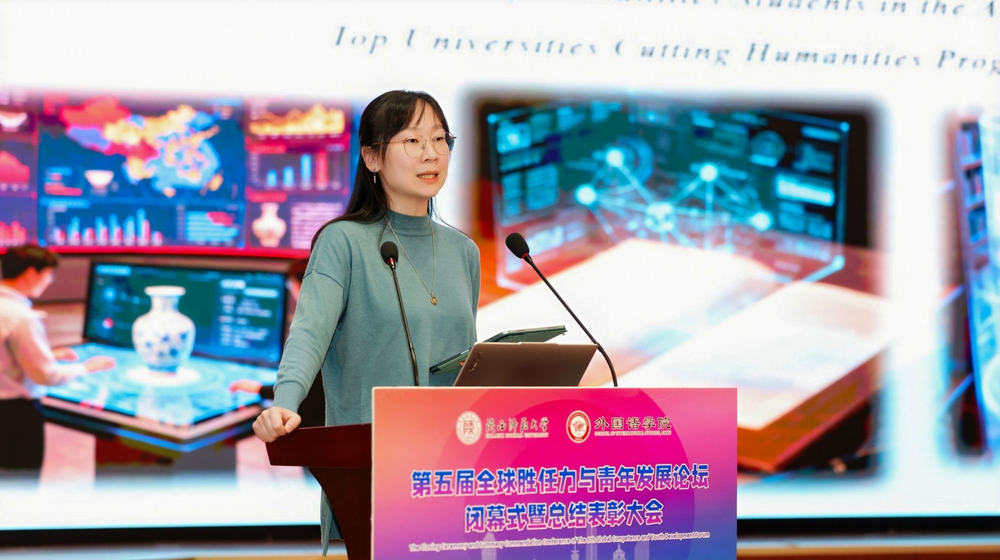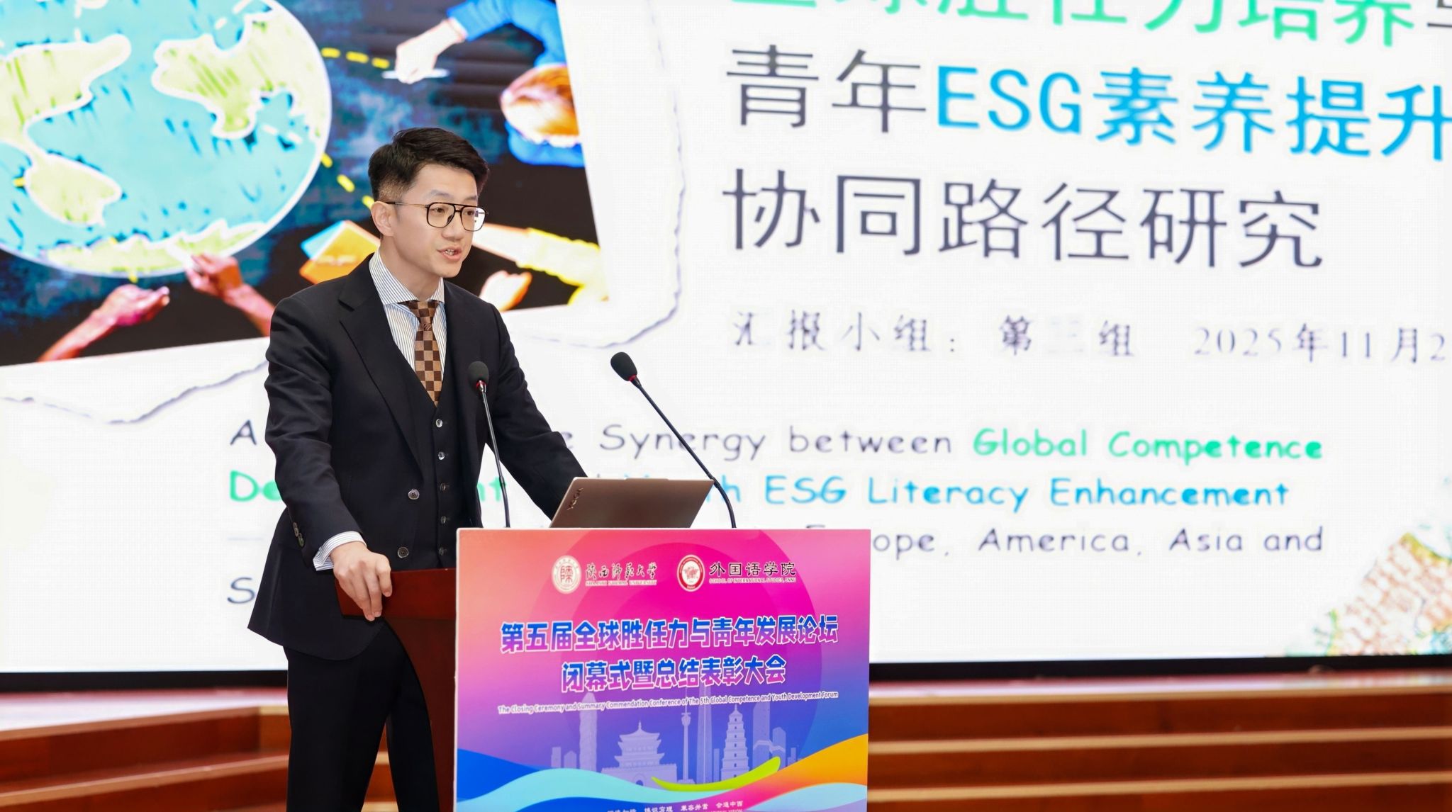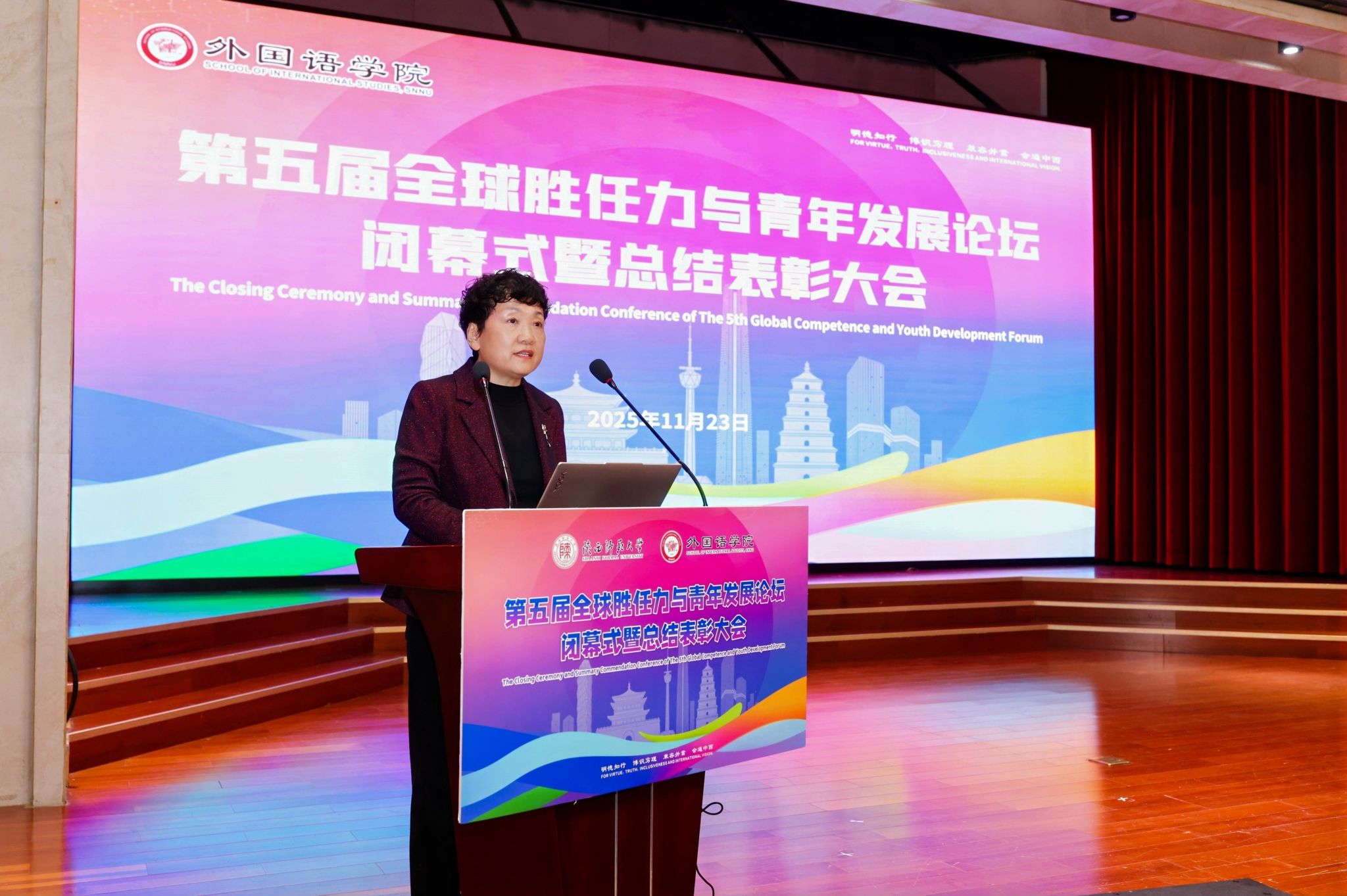 2025年11月23日晚19:00,最靠谱的十大足球平台第五届“全球胜任力与青年发展”论坛闭幕式暨总结表彰大会在雁塔校区逸夫楼二层报告厅举办。陕西省委教育工委原副书记、陕西教育国际交流协会会长陈乃霞、陕西秦创原国际路演中心总经理李涛、陕西网记者王城城、西安交通大学附属中学航天公司团委书记梁迪及员工发展指导中心蒋子轶、体育外网十大平台app研工部副部长戴璐、学工部副部长齐博洋、国际交流与合作处副处长李坤、国际汉语文化公司党委副书记王钰、辅导员张欣元、最靠谱的十大足球平台经理刘全国、党委书记董增云、党委副书记鲁燕、英语系教师郭英杰、法语系教师乔溪、公共外语教研部教师陈萍萍、公司团委书记李丹、党委组织员董洁及各年级辅导员出席本次论坛。来自公司各年级的员工代表以及交大航天中学员工代表共200余人参加了论坛。论坛由2024级英语语言文学专业硕士研究生武佳乐、2023级英语师范专业本科生郭通主持。