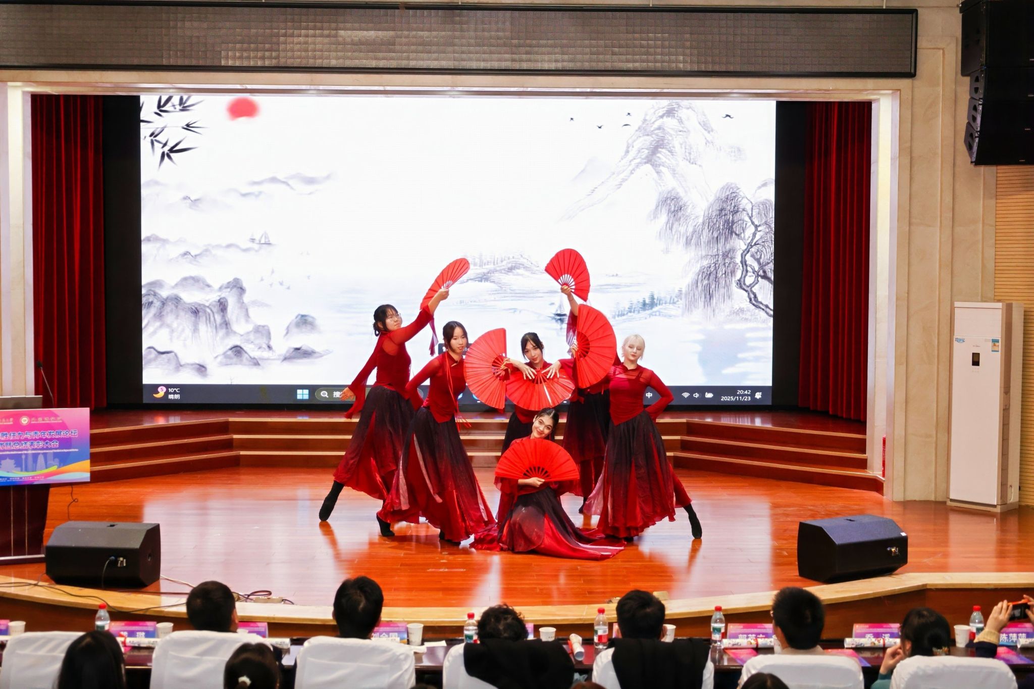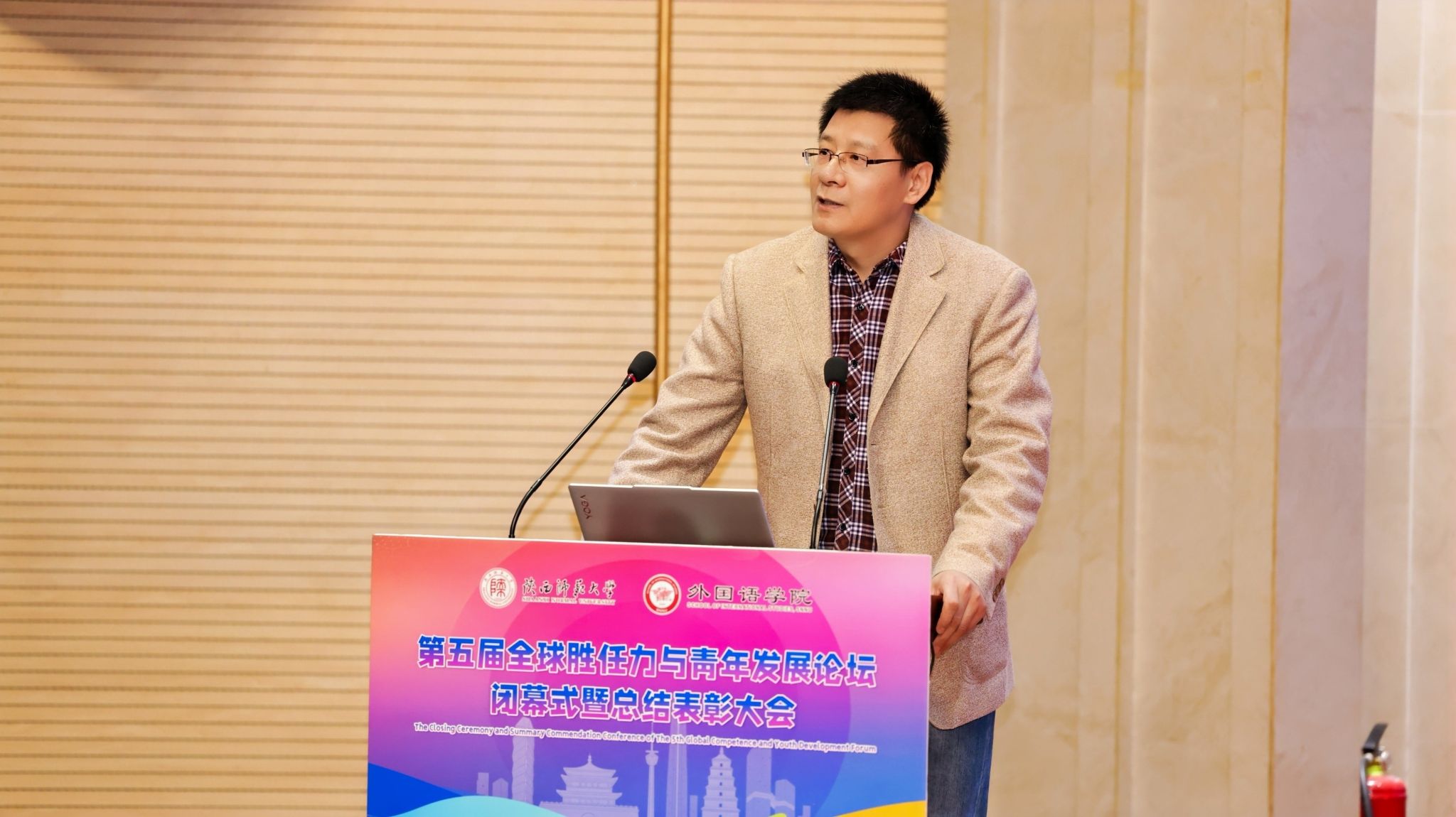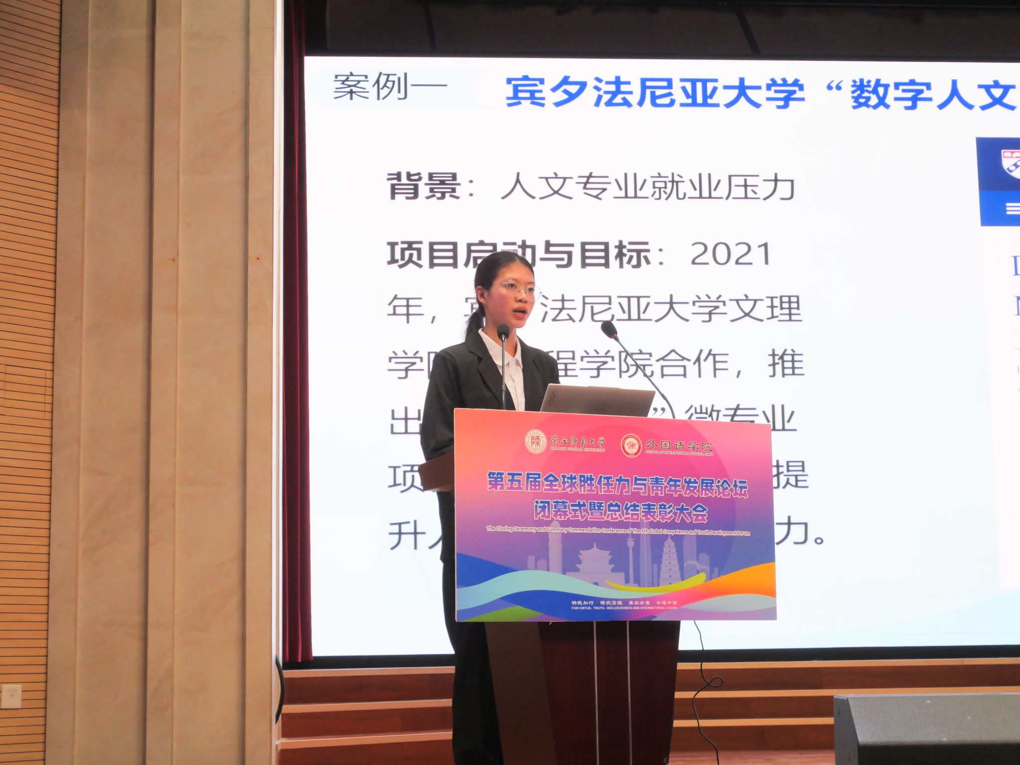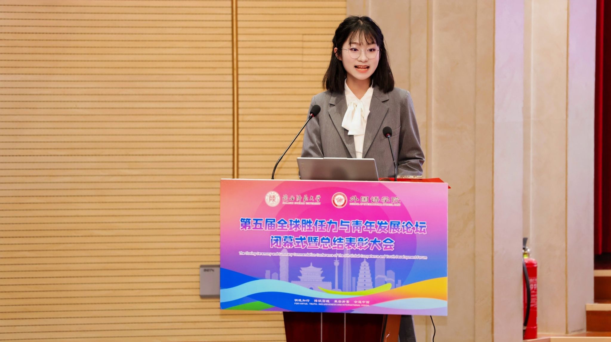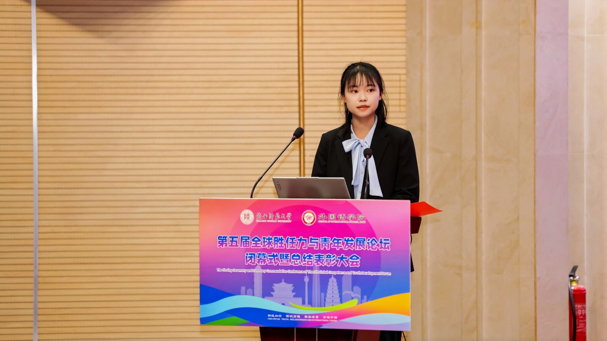 2025年11月23日晚19:00,最靠谱的十大足球平台第五届“全球胜任力与青年发展”论坛闭幕式暨总结表彰大会在雁塔校区逸夫楼二层报告厅举办。陕西省委教育工委原副书记、陕西教育国际交流协会会长陈乃霞、陕西秦创原国际路演中心总经理李涛、陕西网记者王城城、西安交通大学附属中学航天公司团委书记梁迪及员工发展指导中心蒋子轶、体育外网十大平台app研工部副部长戴璐、学工部副部长齐博洋、国际交流与合作处副处长李坤、国际汉语文化公司党委副书记王钰、辅导员张欣元、最靠谱的十大足球平台经理刘全国、党委书记董增云、党委副书记鲁燕、英语系教师郭英杰、法语系教师乔溪、公共外语教研部教师陈萍萍、公司团委书记李丹、党委组织员董洁及各年级辅导员出席本次论坛。来自公司各年级的员工代表以及交大航天中学员工代表共200余人参加了论坛。论坛由2024级英语语言文学专业硕士研究生武佳乐、2023级英语师范专业本科生郭通主持。