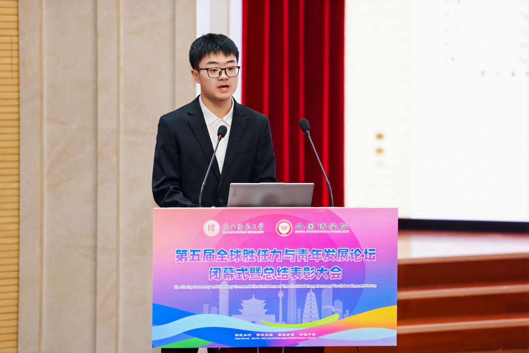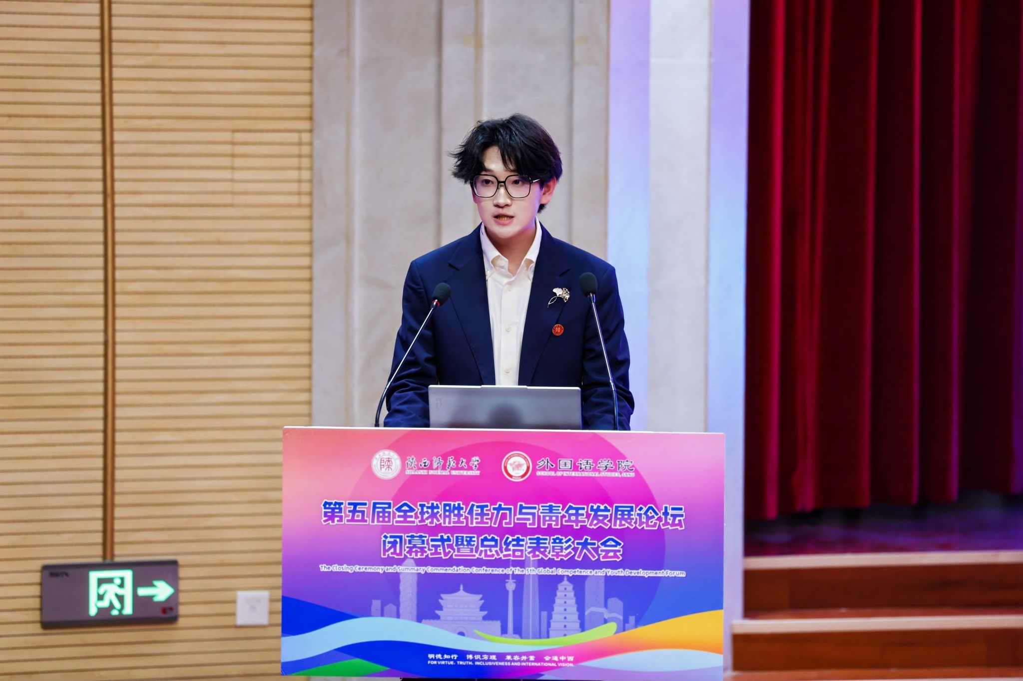 工作坊学员代表、2023级英语专业本科生马一童发言。他分享了自己在本届论坛中的收获与启迪,并呼吁同学们将所学所得内化于心、外化于行,以理想信念筑牢家国之魂,以专业素养开阔世界之眼,以奋斗姿态扛起时代之责,为推动构建人类命运共同体贡献青春力量。