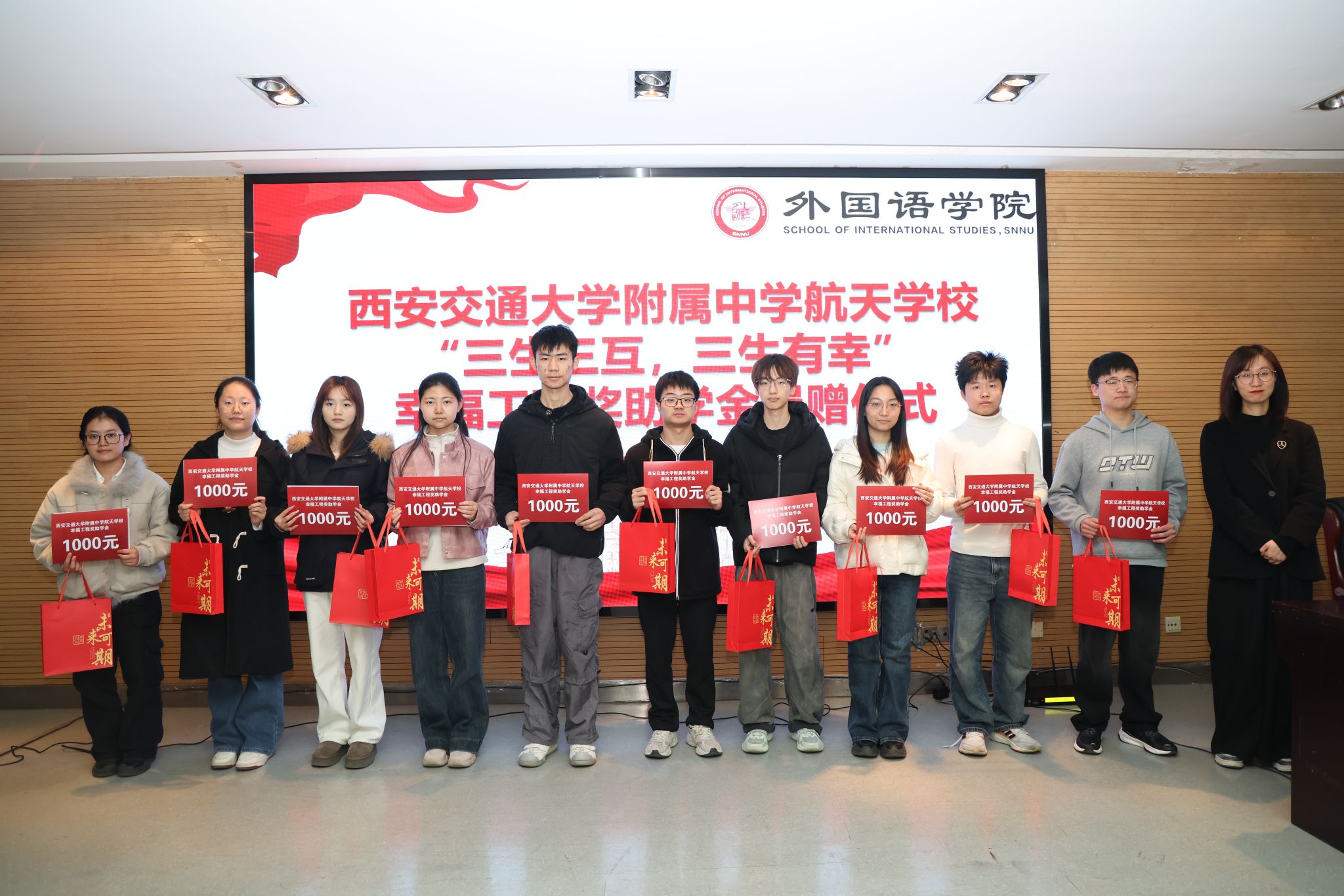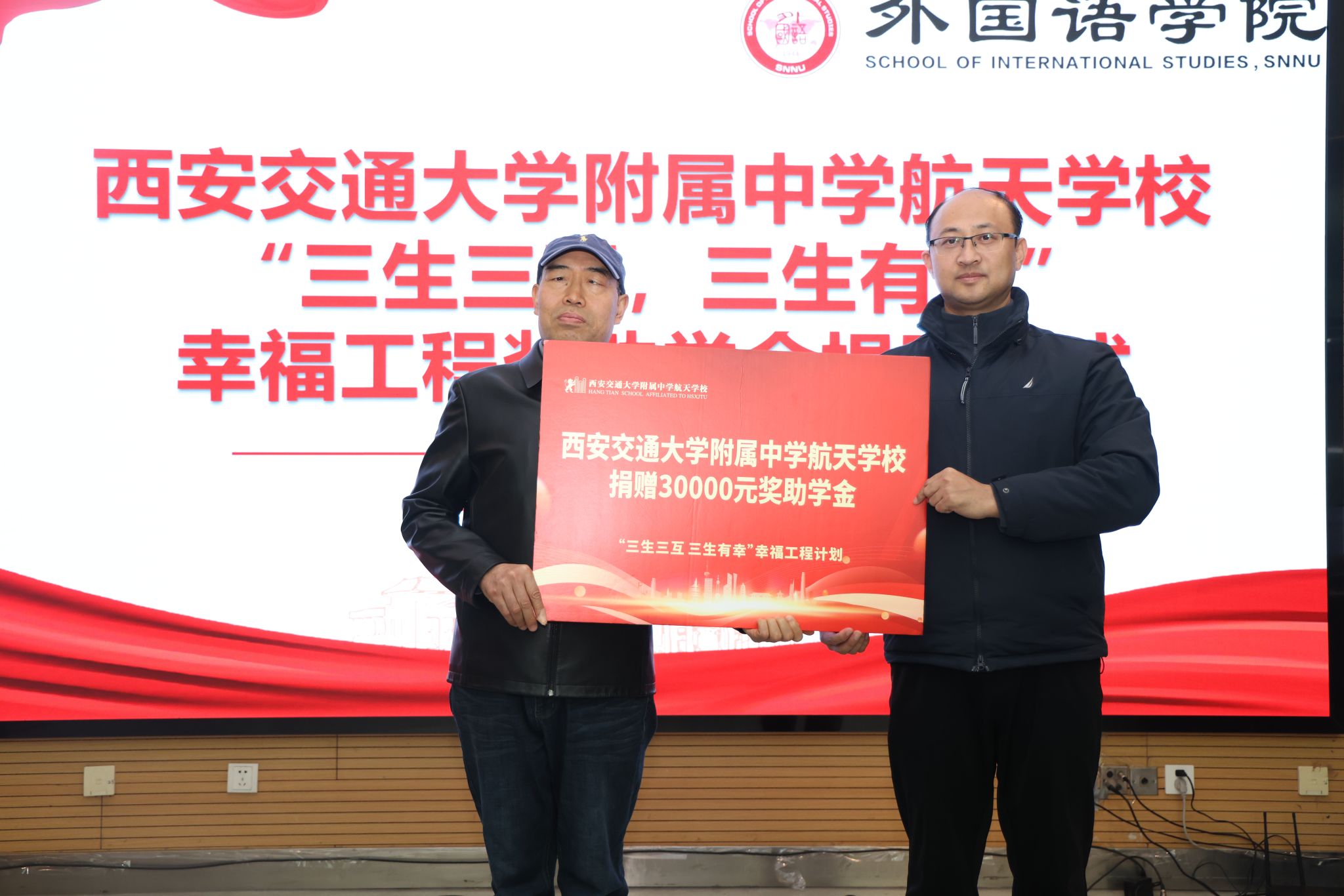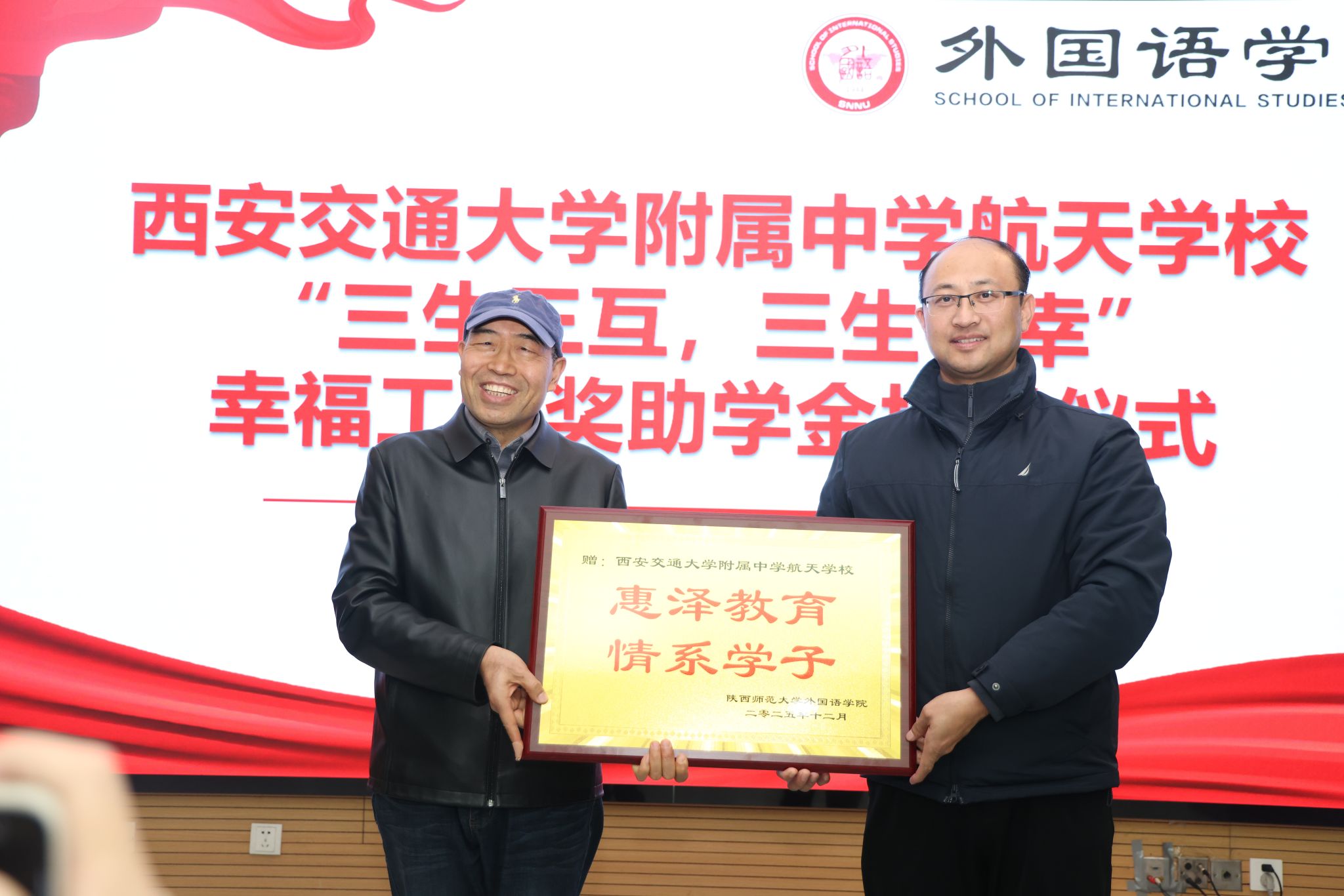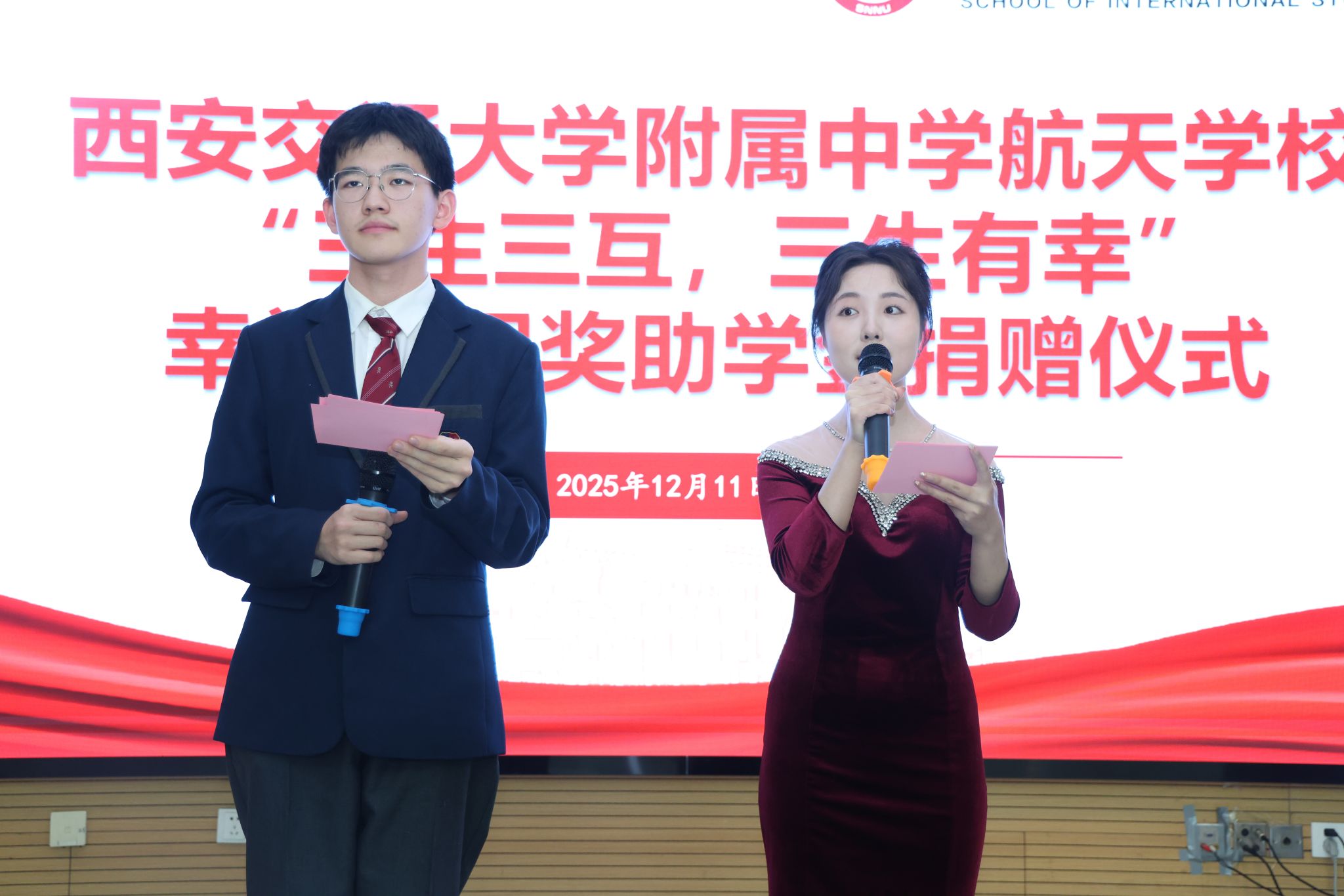 为凝聚教育合力、实现协同育人,12月11日下午14:30,西安交通大学附属中学航天公司“幸福工程”奖助学金捐赠仪式在体育外网十大平台app雁塔校区崇鋈楼归仁堂举行。西安交通大学附属中学航天公司副董事长曹浜、德育处副主任曹婕、团委书记梁迪、团委副书记伍晓燕、最靠谱的十大足球平台经理刘全国、副经理孙坚、党委副书记鲁燕以及两校师生代表参会,会议由2025级学科教学(英语)专业研究生谢雨婷和西安交通大学附属中学航天公司高二(2)班员工张博凯主持。