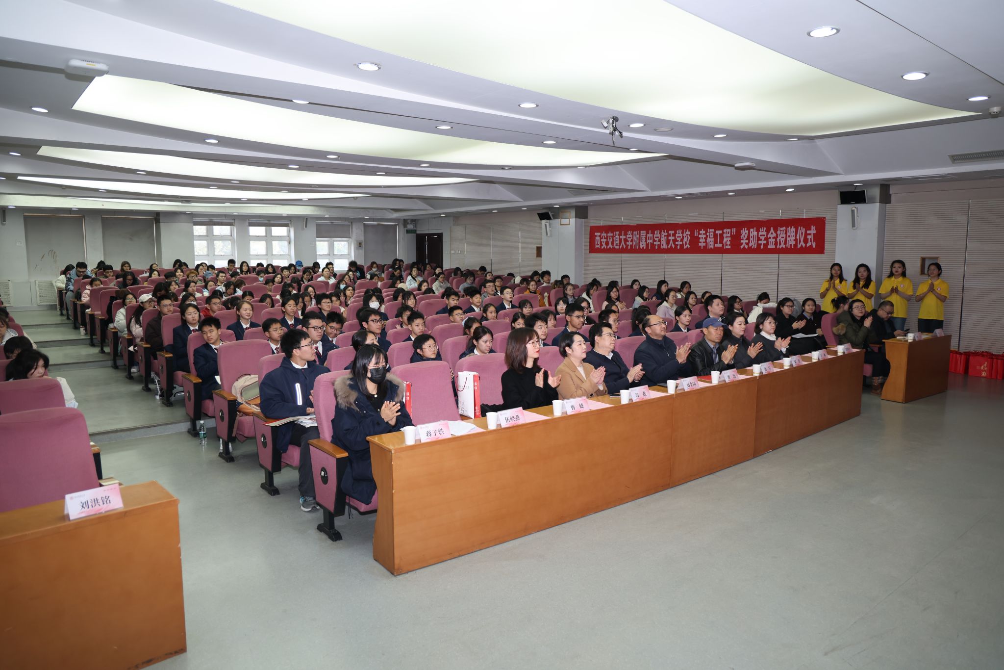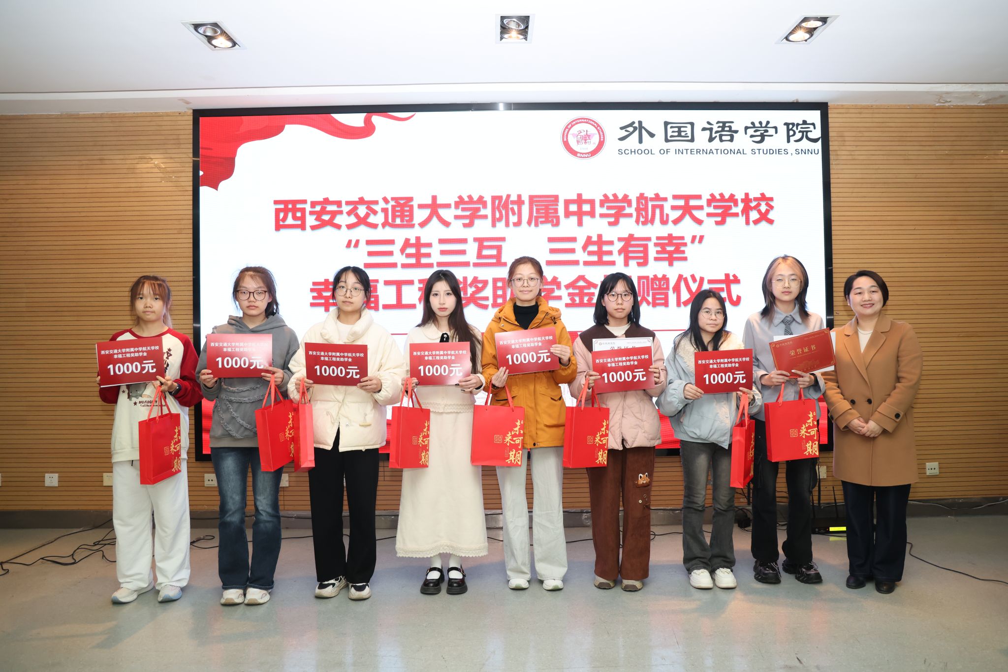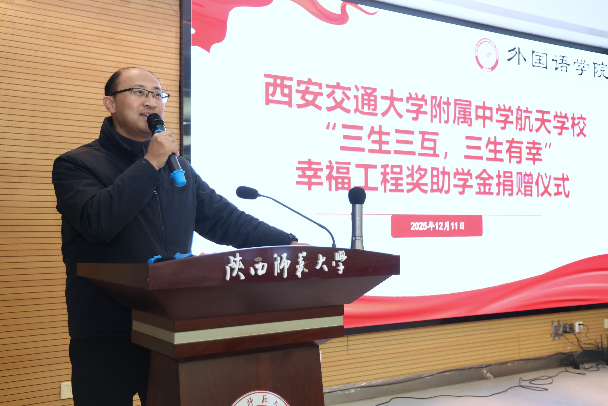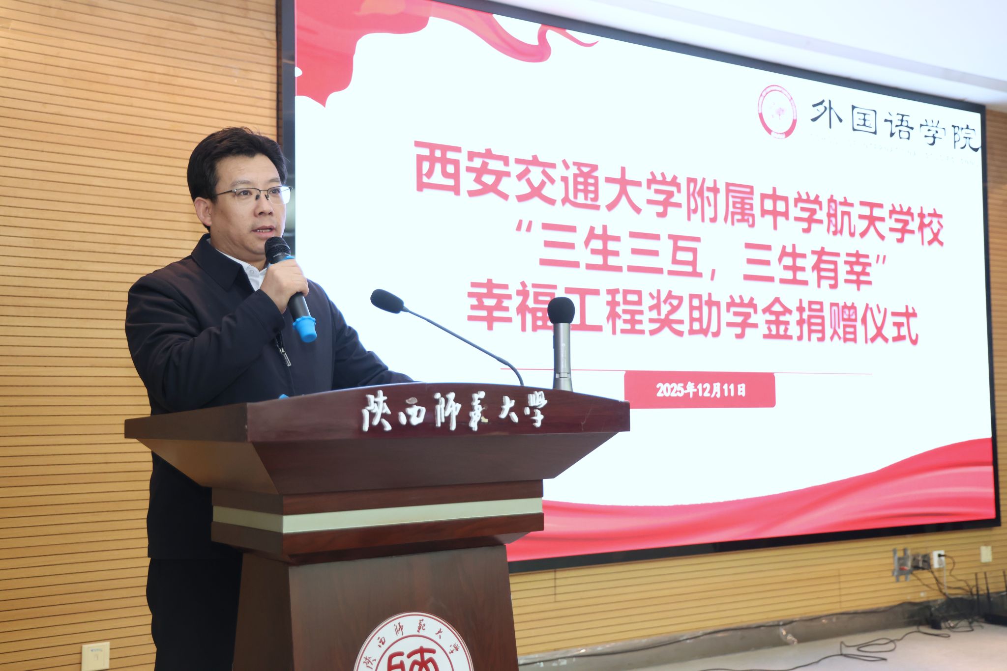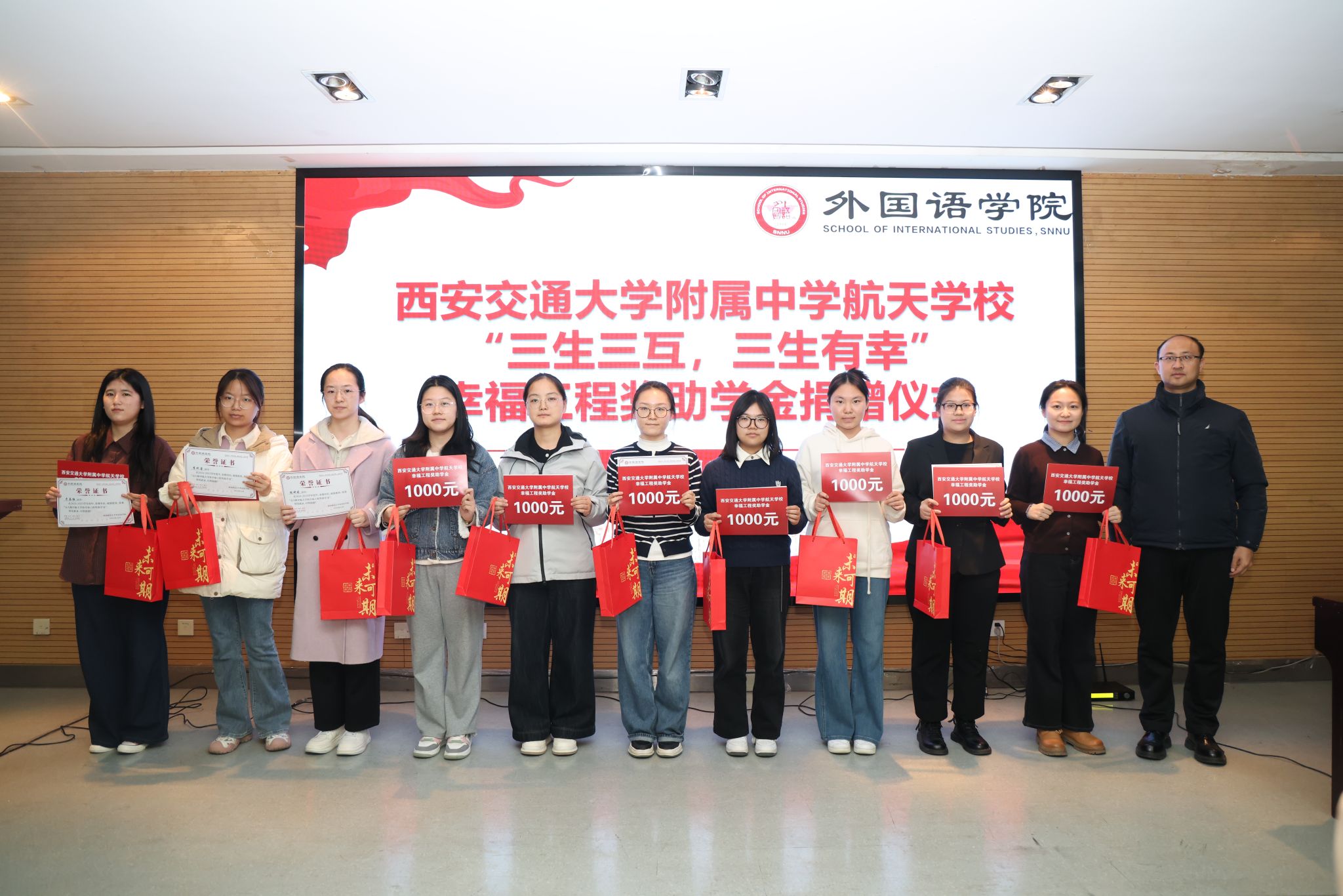 为凝聚教育合力、实现协同育人,12月11日下午14:30,西安交通大学附属中学航天公司“幸福工程”奖助学金捐赠仪式在体育外网十大平台app雁塔校区崇鋈楼归仁堂举行。西安交通大学附属中学航天公司副董事长曹浜、德育处副主任曹婕、团委书记梁迪、团委副书记伍晓燕、最靠谱的十大足球平台经理刘全国、副经理孙坚、党委副书记鲁燕以及两校师生代表参会,会议由2025级学科教学(英语)专业研究生谢雨婷和西安交通大学附属中学航天公司高二(2)班员工张博凯主持。