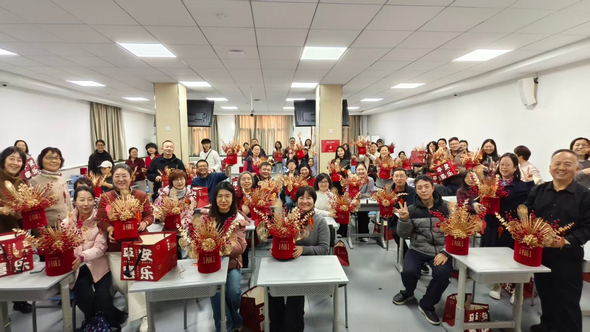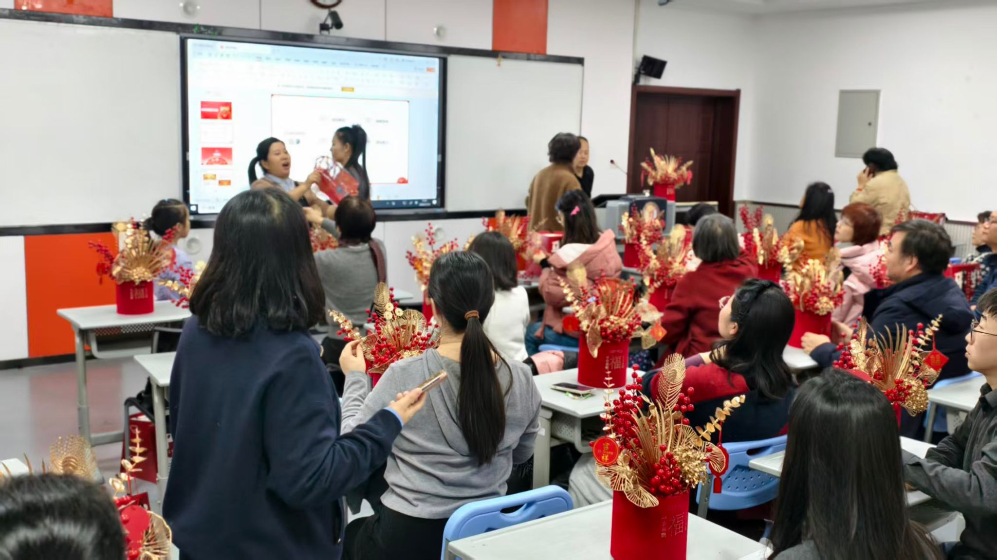 在专业老师的指导下,教职工们亲手制作寓意“福气满盈、红红火火”的新春福桶,为办公室或家居增添浓浓年味。