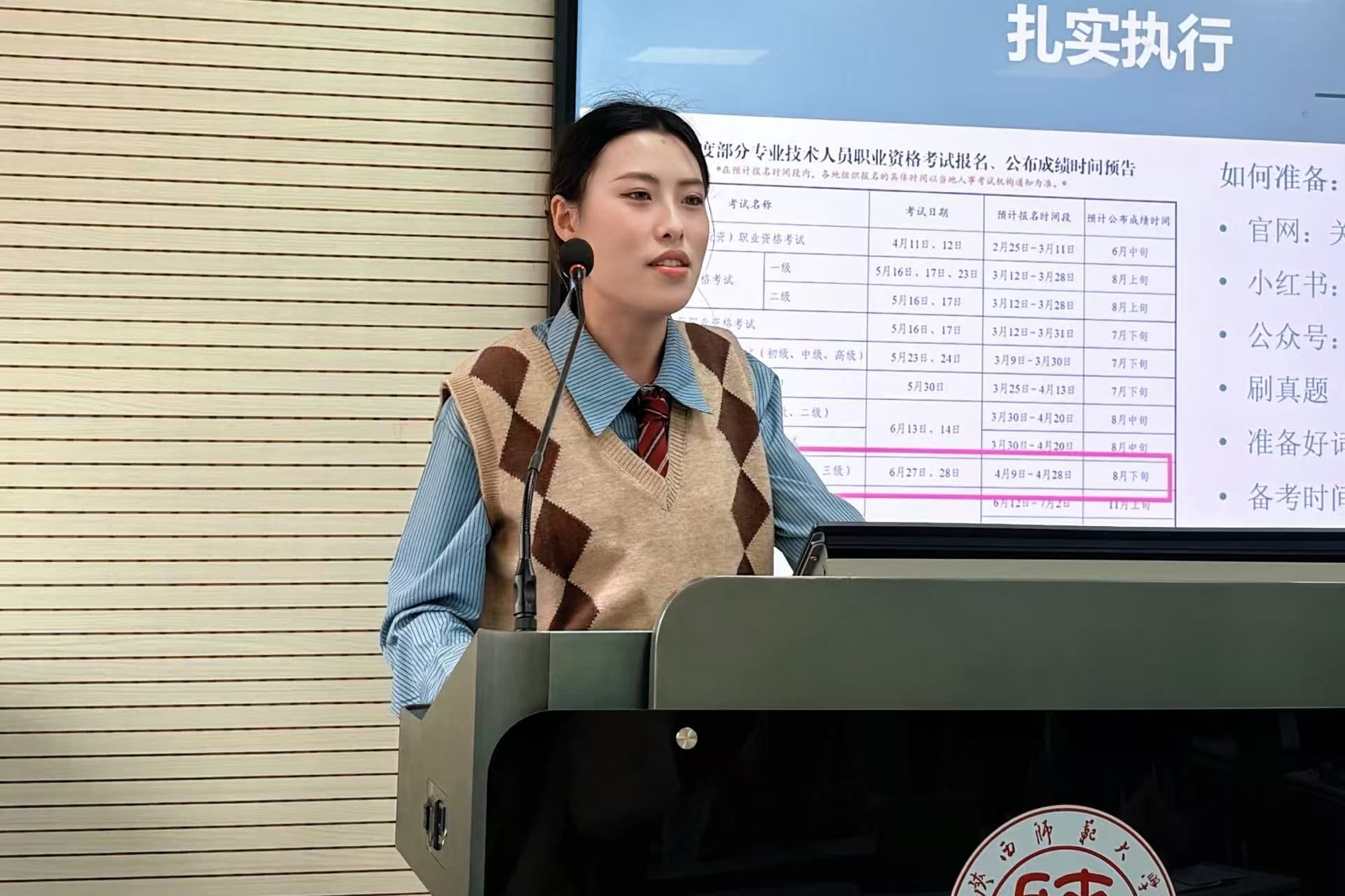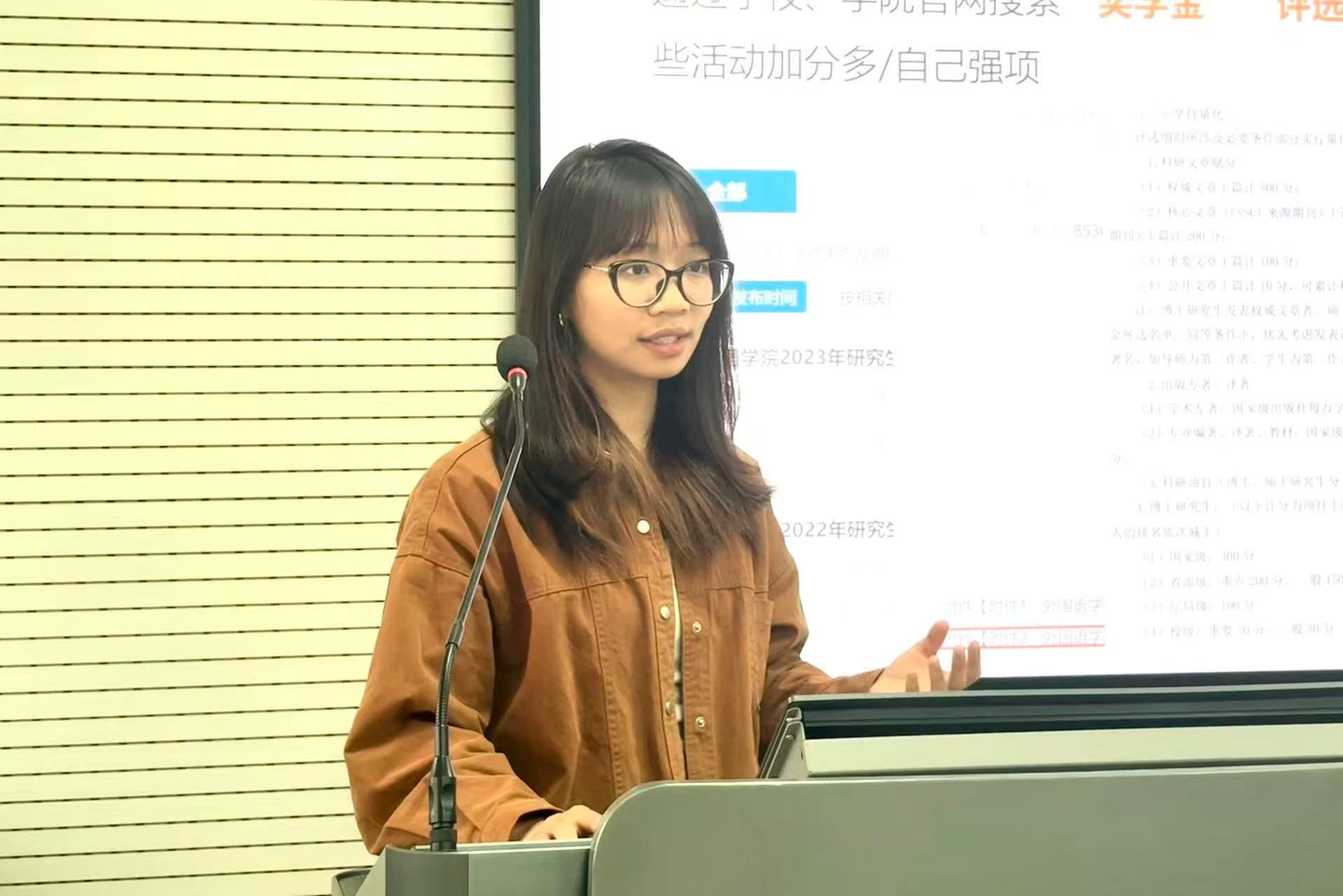 方婉黎以“深耕不辍,终有芳华”为主题进行了分享。她指出,国家奖学金申请者需坚持早规划、强执行的原则,在夯实学业成绩的基础上,重点围绕科研、高水平学科竞赛、社会荣誉、翻译证书、学术会议、社会实践与志愿服务等方面积累加分项。她结合自身经验,给出了具体建议:在科研方面,可优先选择公开发表文章、参与导师课题等路径;在学科竞赛上,力争在“田家炳杯”、外研社“国才杯”等高水平赛事中取得突破;在证书考取上,翻译证书推荐以CATTI为目标进行针对性备考。此外还可参与就业能力大赛、辩论赛等赛事提升综合素养。在积累多元成果的同时,还需重视简历、陈述稿、PPT的打磨技巧,并在日常中积累各类高含金量荣誉与实践经历,凭借多元成果为申请国奖增添强劲助力。