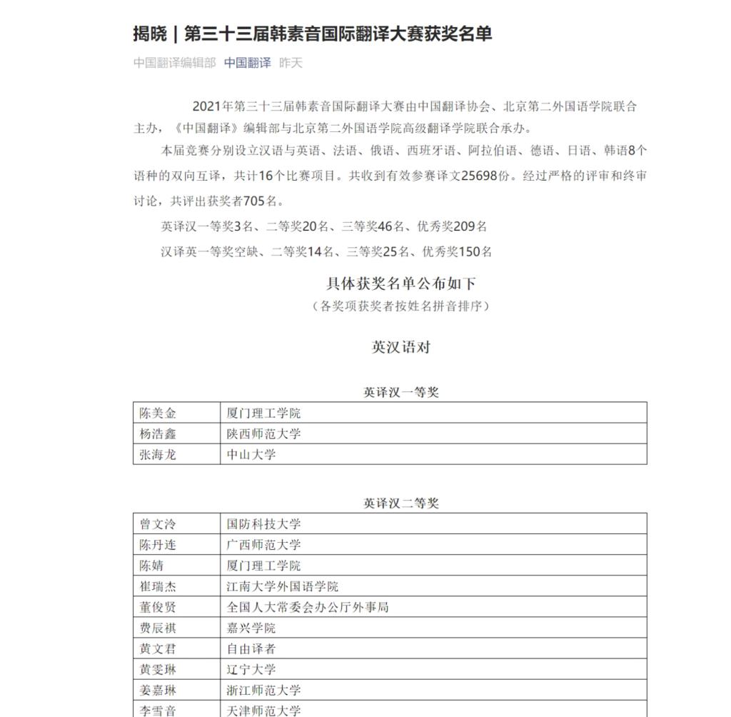 据悉,韩素音国际翻译大赛至今已成功举办三十三届,受到全国乃至海外青年翻译爱好者的欢迎和认可,在语言应用能力、知识涉猎广度与深度、翻译技巧掌握与运用程度等方面对选手提出了较高的要求。因此,公司员工在本次比赛中取得优异成绩是对公司外语人才培养质量的展示,希望更多的外语学子能积极拓展专业知识,成长为卓越的外语人才。
