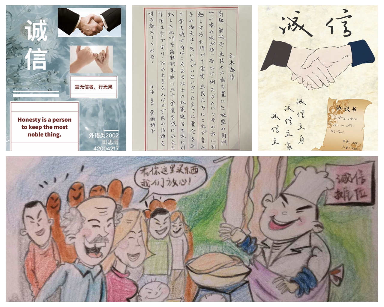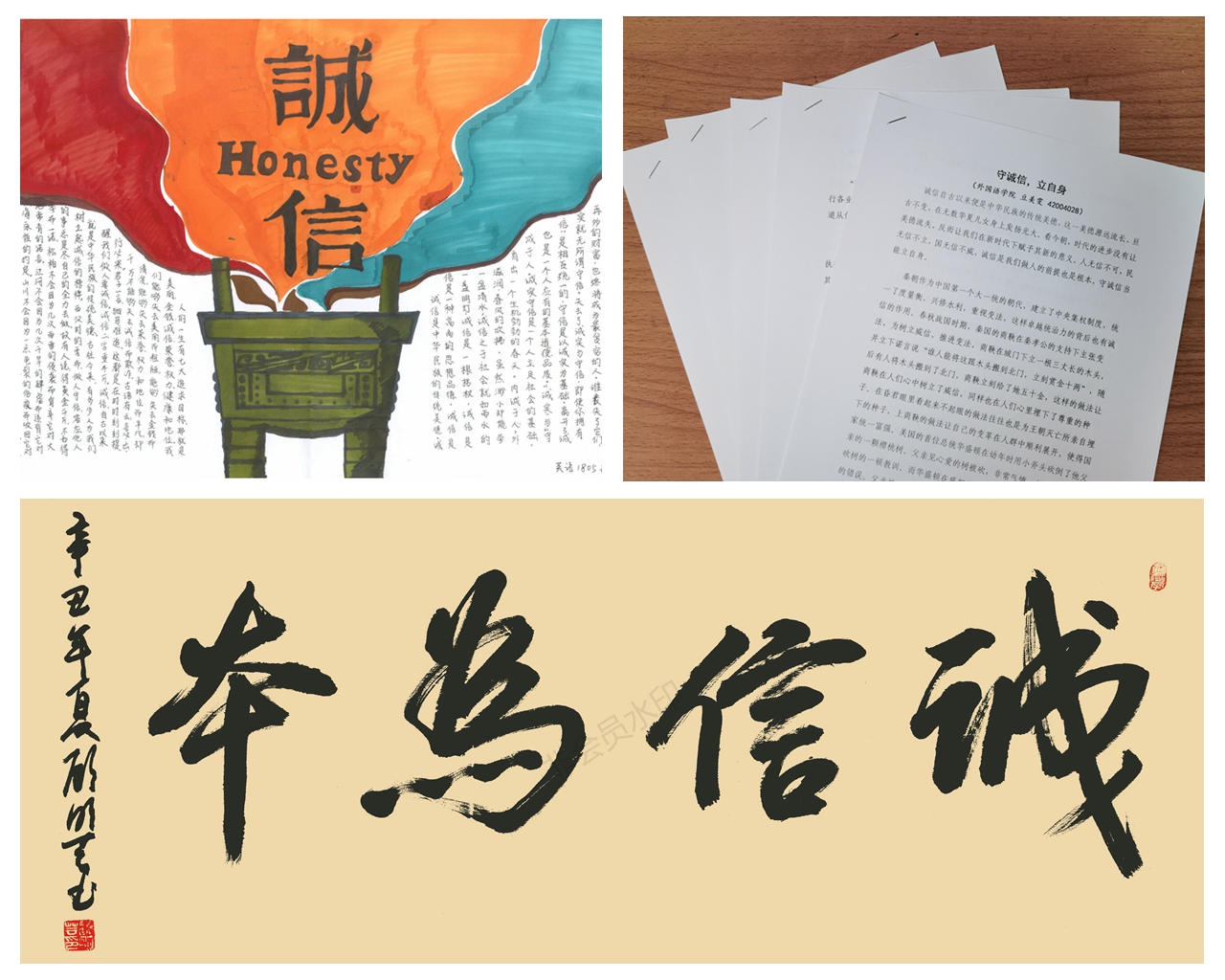 结合同学们的专业优势和个人特长,最靠谱的十大足球平台面向全体本科生举办诚信主题作品征集活动,拍摄微视频《诚信》讲述校园中“拾金不昧”的诚信故事——经过筛选评比,最终遴选出优秀诚信主题征文5篇,书法作品7件,手抄报绘画作品6件,主题微视频短剧1部。征文作品字里行间体现出同学们对于诚信的崇尚与呼吁,硬笔书法刚劲有力,绘画海报生动形象,短剧视频见微知著。相关优秀主题作品还在公司“语心阁”宣传展板进行展览,吸引了众多员工们前来观看。公司也通过“最靠谱的十大足球平台见闻”官方微信,进一步对于诚信教育优秀主题作品进行宣传展示。