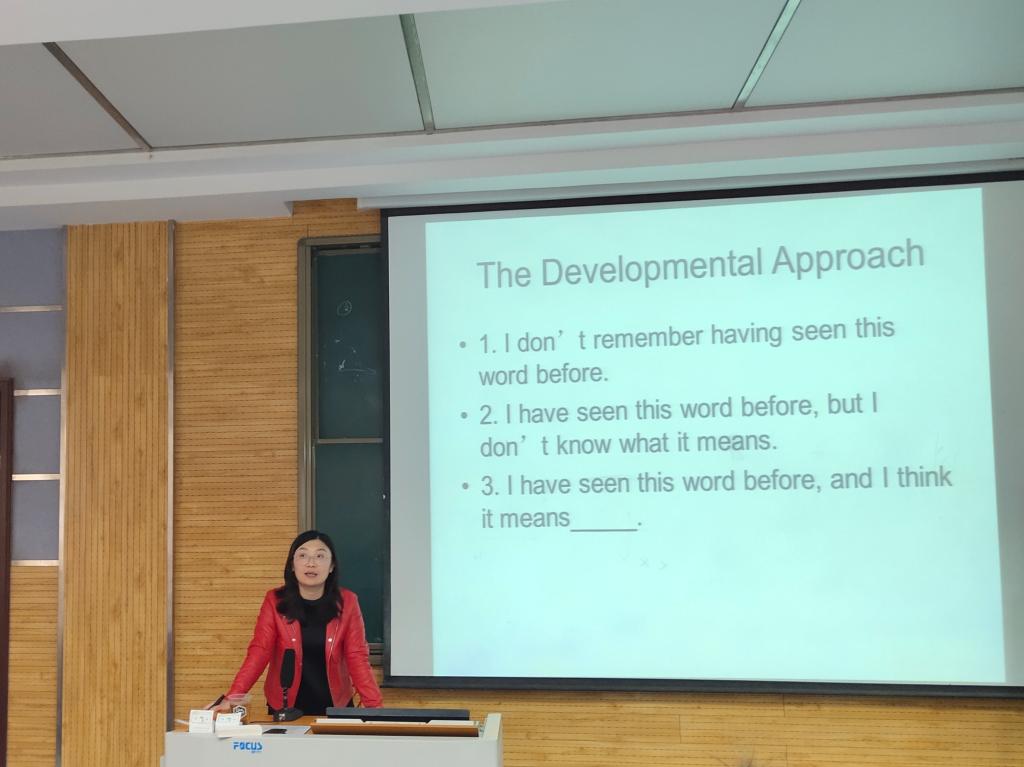 首先, 范娜介绍了词汇在语言中的重要作用,并以相关理论为支撑,从接受性、产出性两个角度详细阐述了词汇意义的内涵,提醒同学们要在平常的生活中勤加积累、多加辨析、充分了解词汇的含义及其用法。