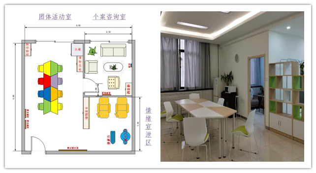 根据实际需要,语心阁共分为三个区域:团体活动室、个案咨询室和情绪宣泄区。