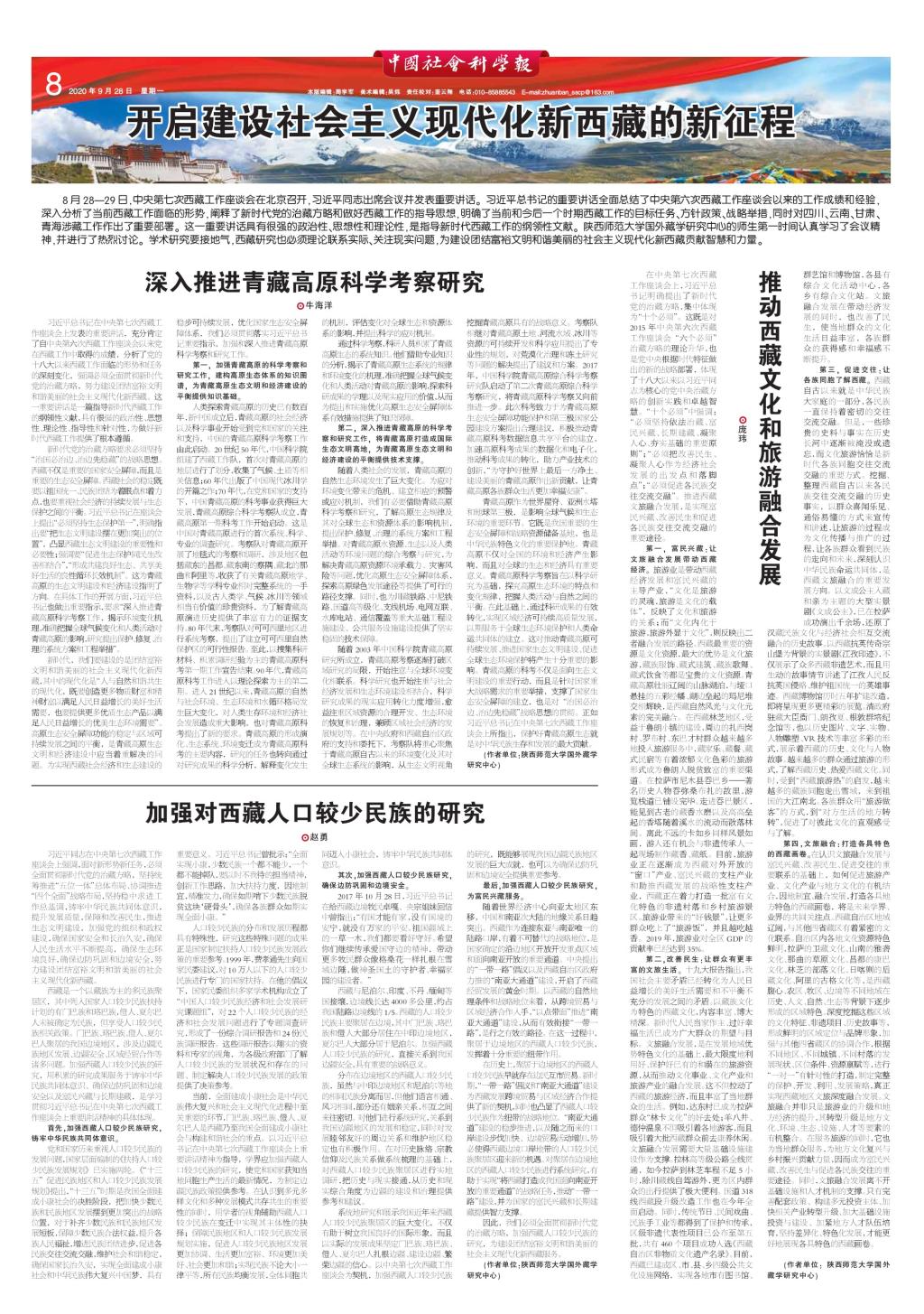 9月28日,《中国社会科学报》在第8版以“开启建设社会主义现代化新西藏的新征程”为主题,专版刊发了公司最靠谱的十大足球平台王启龙教授团队成员的一组署名文章。该组文章共有三篇,依次为牛海洋老师发表的《深入推进青藏高原科学考察研究》、庞玮老师发表的《推动西藏文化和旅游融合发展》以及博士生赵勇同学发表的《加强对西藏人口较少民族的研究》。