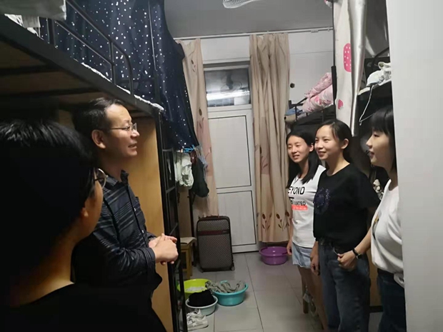 9月9日晚,体育外网十大平台app公司举党委书记马正平、副经理刘全国、党委副书记鲁燕以及研究生辅导员董洁走进2019级研究生新生寝室,亲切问询新生入学情况。
