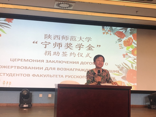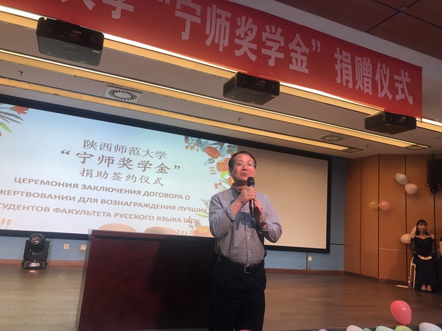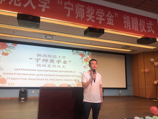 随后,“宁师奖学金”捐助签约仪式正式开始。“宁师奖学金”由公司1972级俄语系首届员工王国宏和其子西安中欧创新技术有限公司总经理宁晶设立,捐助金额共9万元,旨在促进公司俄语人才的培养和俄语系发展。王翠代表俄语系师生向奖学金捐赠人表达了诚挚的敬意和衷心的感谢。宁晶与体育外网十大平台app教育基金会代表杨高玕现场进行捐赠协议书签约。王国宏老师在发言中回顾了自己与俄语的不解之缘,勉励俄语系员工要珍惜在校时光、打好专业基础,奋发图强,为中俄两国文化的传播贡献自己的力量。宁晶在发言中谈到母亲与师大俄语系的紧密联系,并祝愿师大越办越好。马正平代表公司感谢俄语系员工的无私捐助,他强调这是员工在公司层面设立的第一个奖学金,对员工来说是一笔珍贵的资助,对教师来说是无声的鼓励,一定会用好这笔奖学金,争取培养更多优秀的俄语人才。
