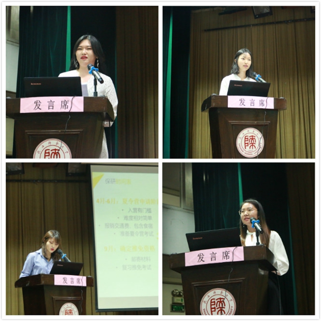 “求知若饥,大智若愚”,保研至中国人大2015级翻译班黄嘉嘉以此为题讲到,对于学习,我们要保持纯粹的心态;而对于考研,我们应主动出击、积极准备。操林英老师用英文道出了热情洋溢的寄语,告诉同学们,要变得和台上的学姐一样优秀,必须坚持对专业的热爱和执着。