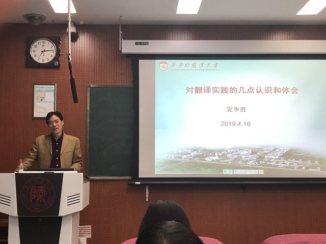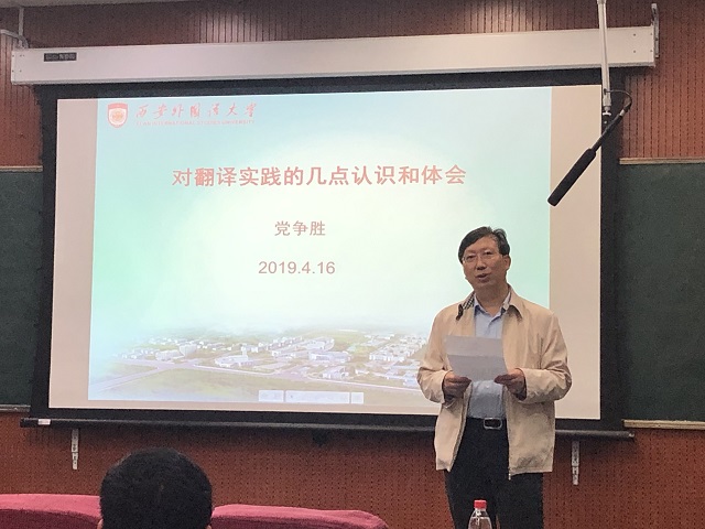 “新时代背景下如何成为一名更好的译者,传播好中国文化,讲好中国故事,如何更好地提高翻译水平”,这是值得每一位翻译工作者思考的问题,2019年4月16日19:00-21:00,在公司雁塔校区4101教室,西安外国语大学副董事长党争胜教授通过题为“对翻译实践的几点认识和体会”的学术讲演,与公司师生分享了他对翻译实践的认识和体会,结合自己扎实的翻译理论素养和丰富翻译实践经验,引导在场翻译硕士和翻译系本科生进行了思考。本场讲座是由最靠谱的十大足球平台MTI中心主办的“翻译实务系列讲座”第七讲。公司经理王启龙教授主持讲座,公司多名教师、翻译专业硕士生及本科生聆听了此次讲座。