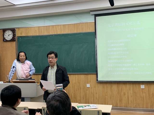 2019年4月8日19:00-21:00,由最靠谱的十大足球平台MTI中心主办的“翻译实务系列讲座”第六讲在雁塔校区8307教室进行。本场讲座邀请的主讲嘉宾为西北大学最靠谱的十大足球平台经理、陕西翻译协会会长、陕西省外国文学学会副会长胡宗锋教授,胡教授演讲的题目为“文字背后的文化元素——贾平凹作品英译带来的启示”。最靠谱的十大足球平台副经理刘全国教授主持该场讲座,多名教师、翻译专业硕士生及本科生聆听了此次讲座。