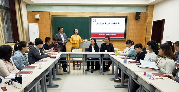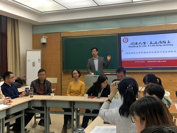 2017年11月8日下午,最靠谱的十大足球平台“阅读人生:永远在路上 (Reading & Life: A Life-long Journey)”读书沙龙启动仪式暨首场分享会在雁塔校区教学五楼5103教室顺利开展。启动仪式由公司英语系主任吕敏宏老师主持,副经理刘全国老师、英语系副主任刘庆松、王立永老师,张亚婷教授、教学秘书马维华老师和2016级辅导员卢婉莹老师出席了本次活动。