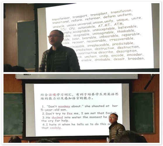 八十三中刘少文老师于11月29日上午10点,在教学四楼4301为同学们作了题为“高中英语词汇教学”的专题讲座。刘老师结合新课程的要求,从情境创设、语境感知、发现规律、情境运用等四个方面简要介绍了有效进行词汇教学的方法;同时,为同学们分享了他从教多年的心得及自己的课程观和课程体系;最后,刘老师针对同学们未来的专业学习方向,建议同学们加强学习,多思考,多实践。