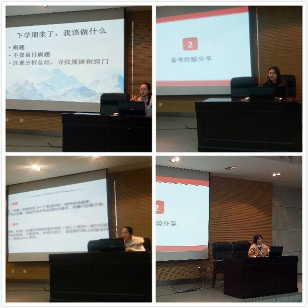 随后,来自公司2014级、2015级四位专四考试成绩优异的同学为同学们分享了自身的备考经验。王裔迪同学强调了积极调整备考心态的重要性;刘雯璐同学从复习计划的制定和实施方面给出了自己的建议;黄嘉嘉建议同学们根据自己的实际状况有效备考,切忌盲从;王静同学则以各个题型为切入点,细致介绍了了应试方法与技巧。