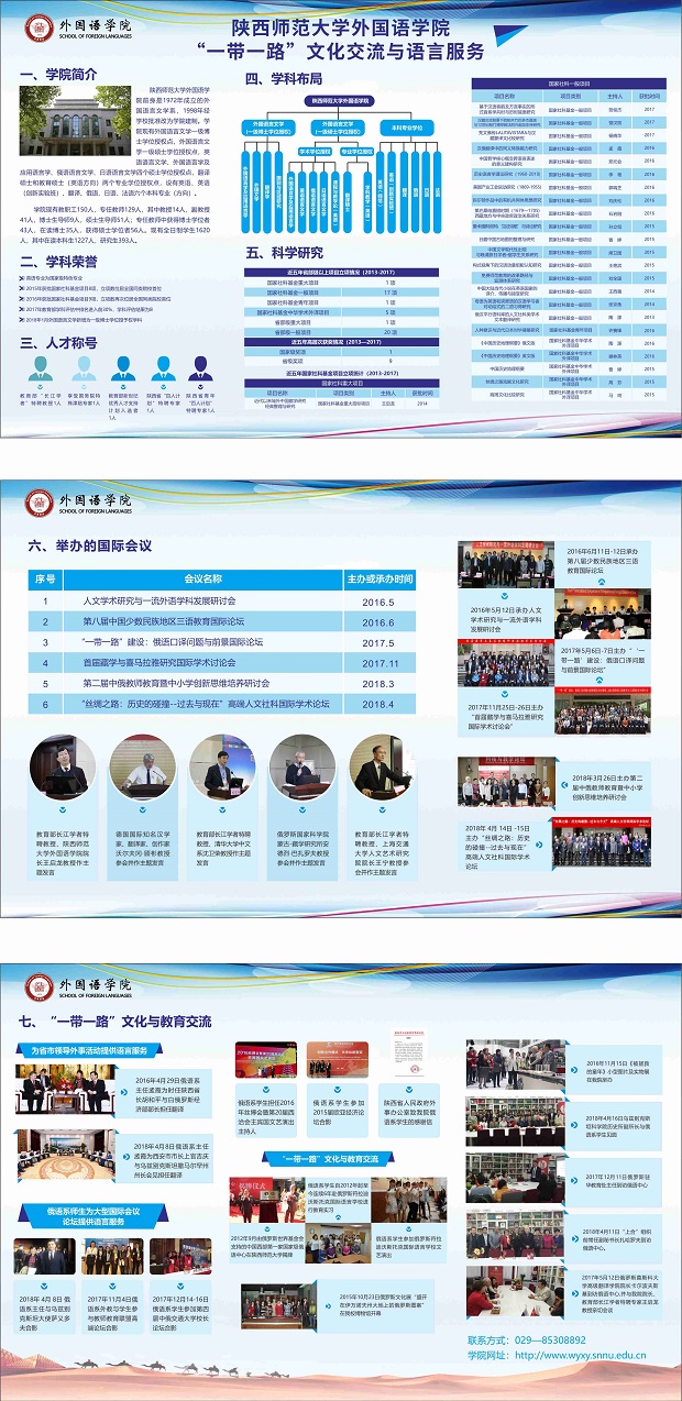 2018年5月26日至30日,最靠谱的十大足球平台受邀参加了在西安曲江国际会展中心举办的第二届陕西“一带一路”科技创新创业博览会并于B1馆展示公司“一带一路”文化交流与语言服务项目。公司展位从最靠谱的十大足球平台简介、学科荣誉、人才称号、学科布局、科学研究、国际会议、“一带一路”文化与教育交流等七个方面立体化地展示了公司近年来取得的可喜成绩。