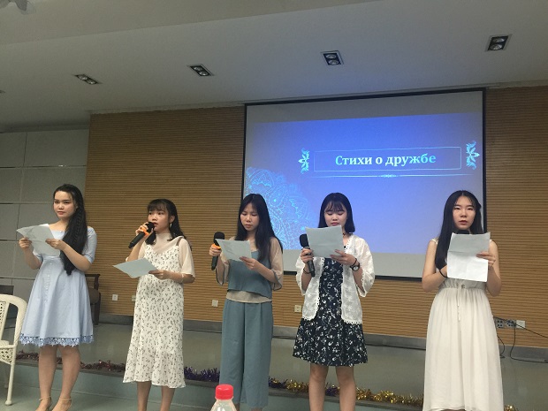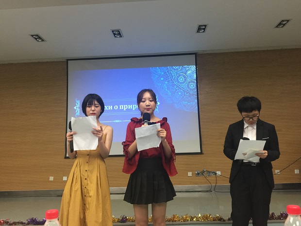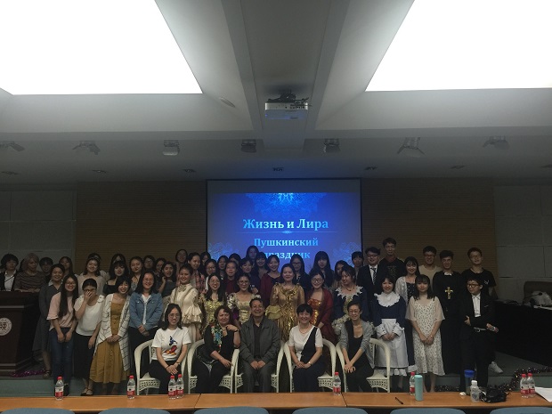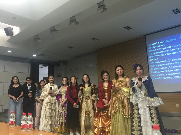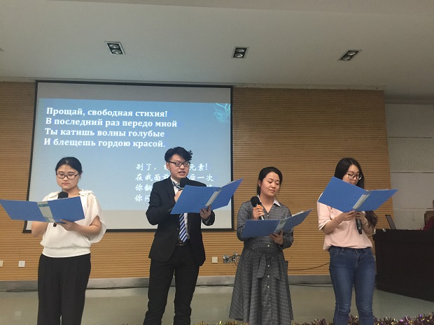 活动中,同学们从朗诵普希金的诗歌表达了对普希金的崇敬,又通过俄语歌曲表达了对俄语学习的热爱,尤为精彩的是,2015级同学演唱的由孟霞教授和娜塔莉·察廖娃教授共同翻译的俄语版《泪蛋蛋抛在沙蒿蒿林》,精彩地表现出了陕北民歌与俄语碰撞出的火花。此外,普希金的著作《暴风雪》和《黑桃皇后》在同学们的精心编排表演下,将一场有着俄罗斯文化特色的舞台剧呈现在大家面前。随后大屏幕播放了2018届毕业生的视频剪辑,视频再现了2018届毕业生们从入学到毕业四年间的成长过程,在这里挥洒着青春的汗水,从这里出发,迈向充满无限可能的未来。
