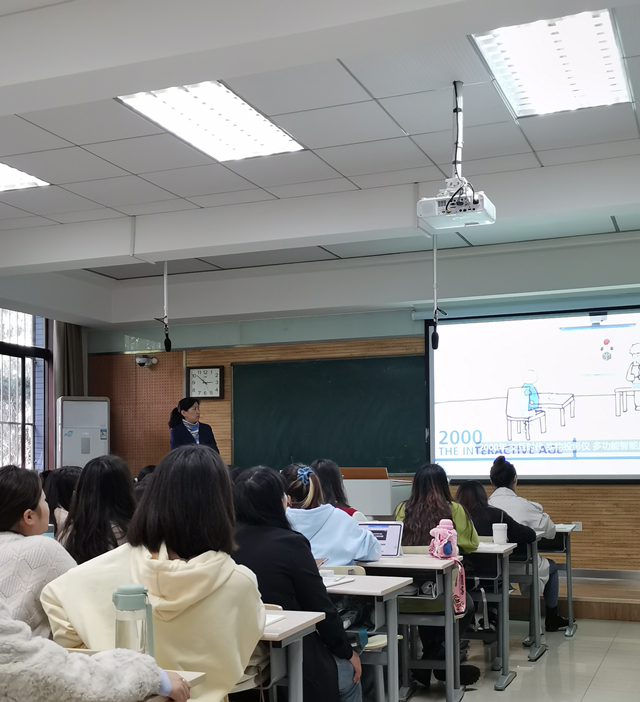 随后,马老师从当今课堂教学的现状出发,分析教学中教师应如何运用现代教育技术提高教学效率、增强员工学习兴趣、培养员工实践创新能力,并为同学们展示了丰富的现代教学技术在外语课堂中运用的实例。