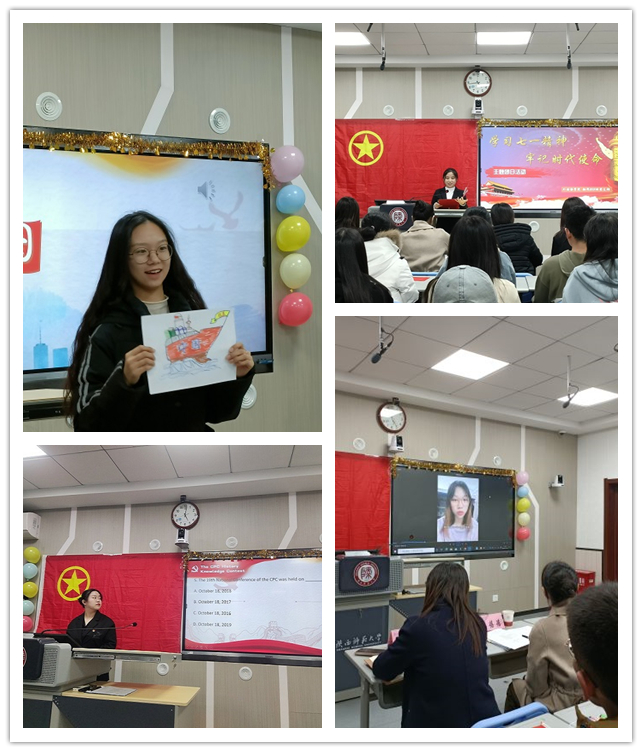 随后,在主讲人齐思雨的领学下,团支部全体成员共同学习了习近平总书记“七一”重要讲话精神内容,同时结合专业特色,开展了党史学习的英文知识竞答。在实践活动“共绘蓝图”部分,团员们现场围绕抽取的主题——“改革开放”进行创作,完成后以小组为单位进行了作品展示。根据现场投票结果,最终第四团小组的作品《改革开放的巨轮》被选为最佳作品。最后,来自2021届翻译班,现就读于北京外国语大学的王如兰学姐通过一段视频与同学们一起分享了自己在大学期间向党组织靠拢的心路历程和学习经验,鼓励同学们明确目标,奋进前行。