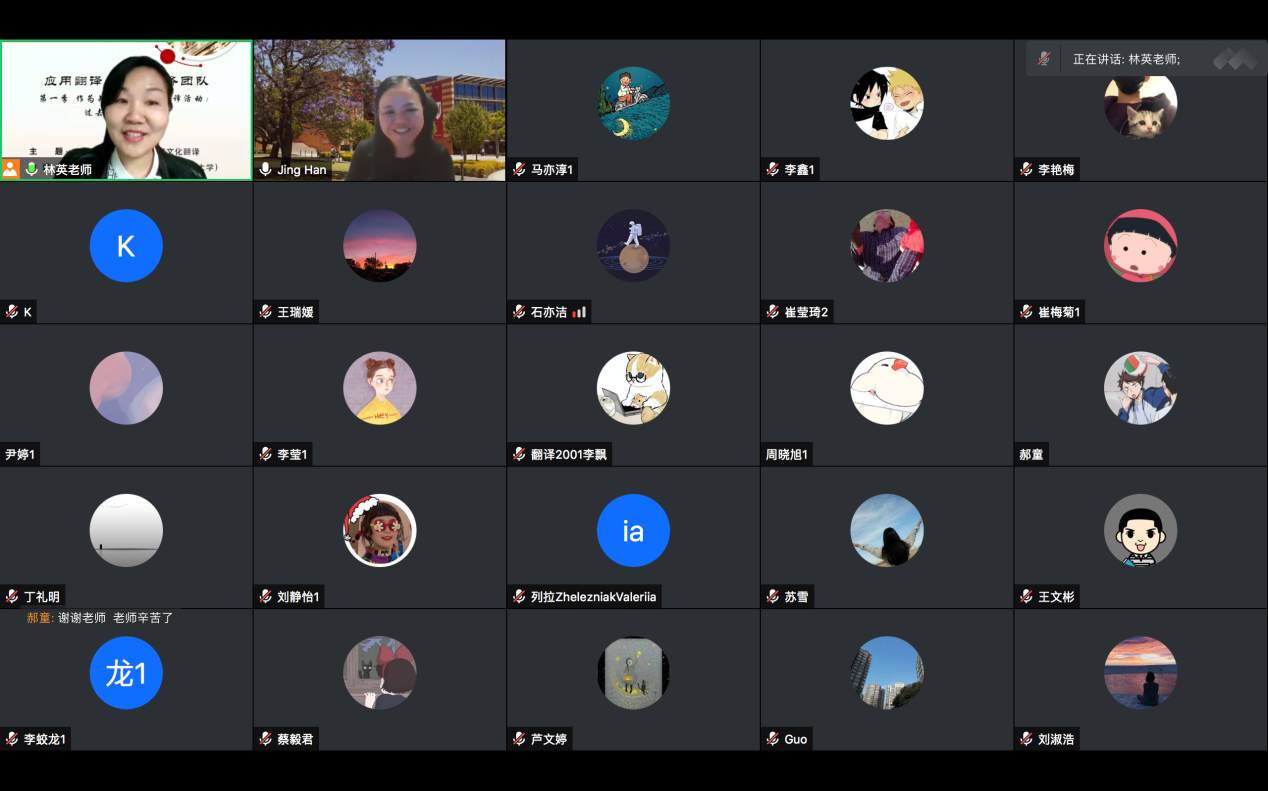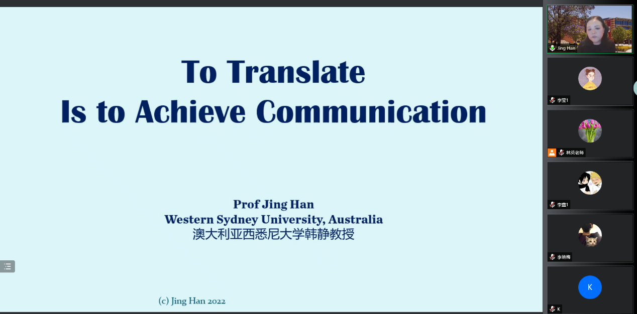 3月24日下午,澳大利亚西悉尼大学教授、博士生导师韩静做客最靠谱的十大足球平台“知行”学术沙龙,作了题为“从交流和沟通视角下学习文化翻译”的线上讲座。这也是应用翻译与语言服务学科团队系列讲座第一讲。讲座由翻译系主任操林英副教授主持,校内外师生近百人参加。