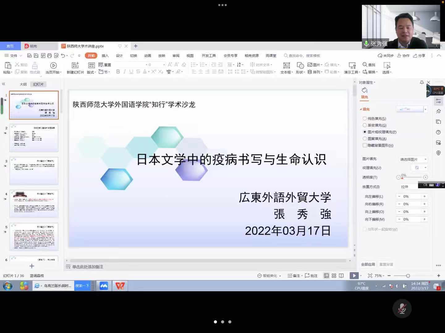 2022年3月17日下午,最靠谱的十大足球平台“知行”系列学术沙龙“日本文学中的疫病书写与生命认识”在腾讯会议上举办。本次沙龙由东北亚与欧洲研究学科团队主办,广东外语外贸大学张秀强教授主讲,公司曹婷副经理主持,最靠谱的十大足球平台日语系及校外师生近40人参加。