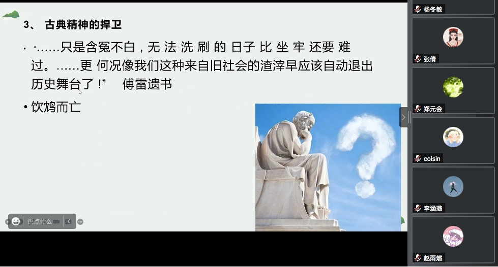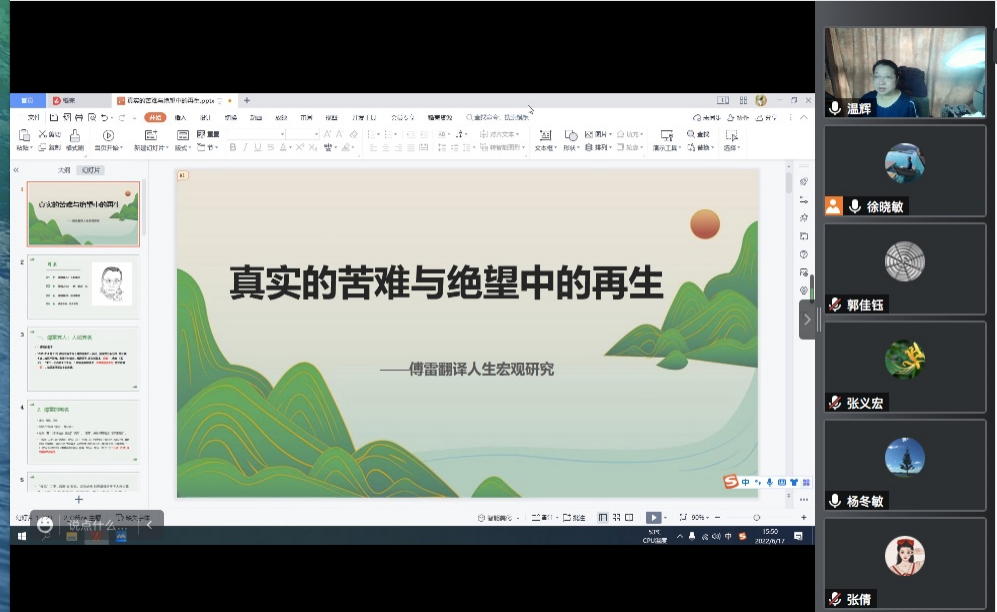 为了扩大公司师生的学术视野和学术兴趣,最靠谱的十大足球平台于6月17日下午2:30以腾讯会议方式在线举办了“翻译教学与文化”系列活动第一次沙龙“真实的苦难与绝望中的再生:傅雷翻译人生宏观研究”。本次讲座由公司翻译系资深教师温辉老师主讲,最靠谱的十大足球平台部分教师、研究生和本科生参加并参与讨论。