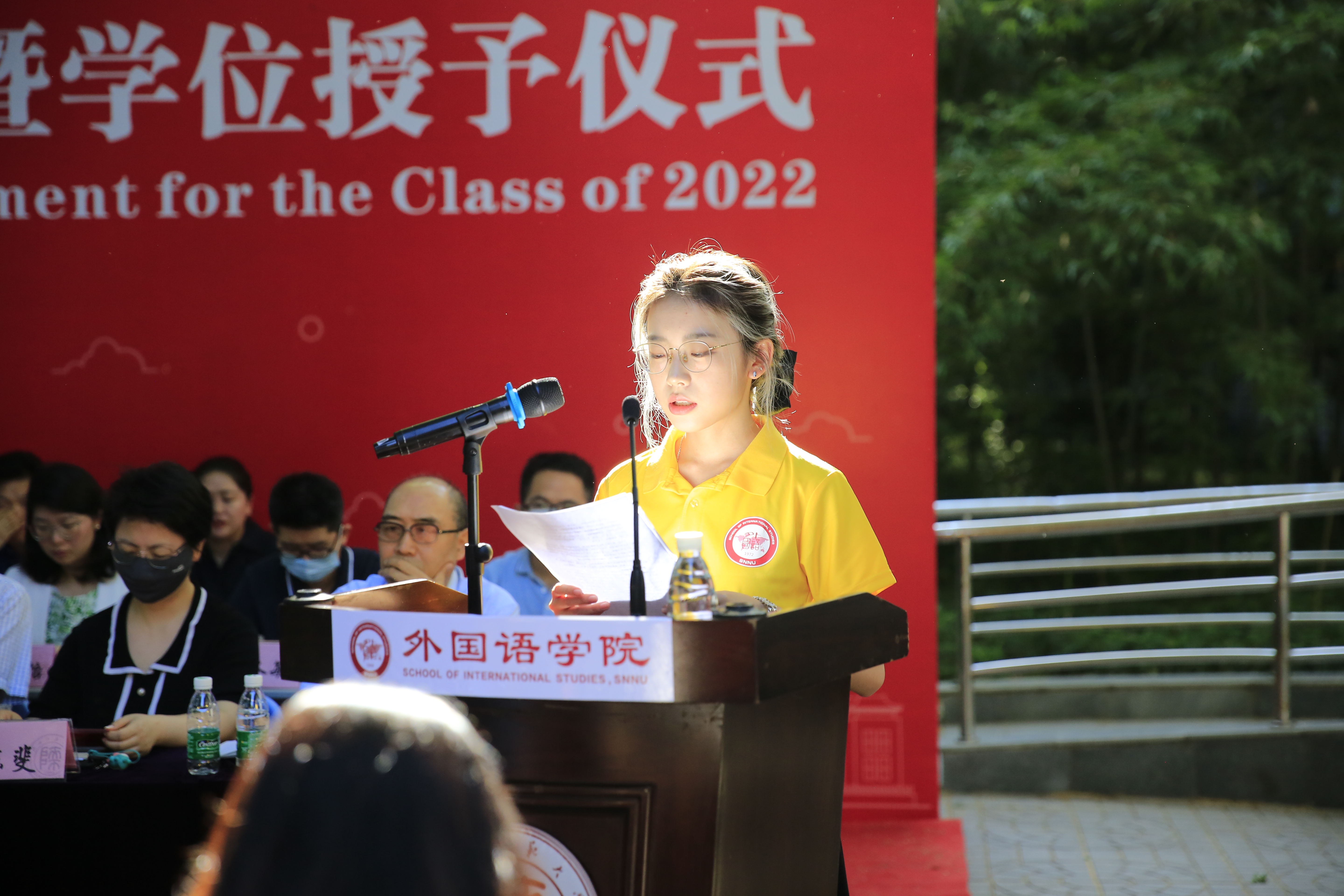本科生代表、2018级日语专业的陈子淇同学即将赴外交公司深造。她表达了自己对于老员工活的不舍和对同学的深切的祝愿,以及努力作一名优秀的外语人,走向更广阔的世界的信念。