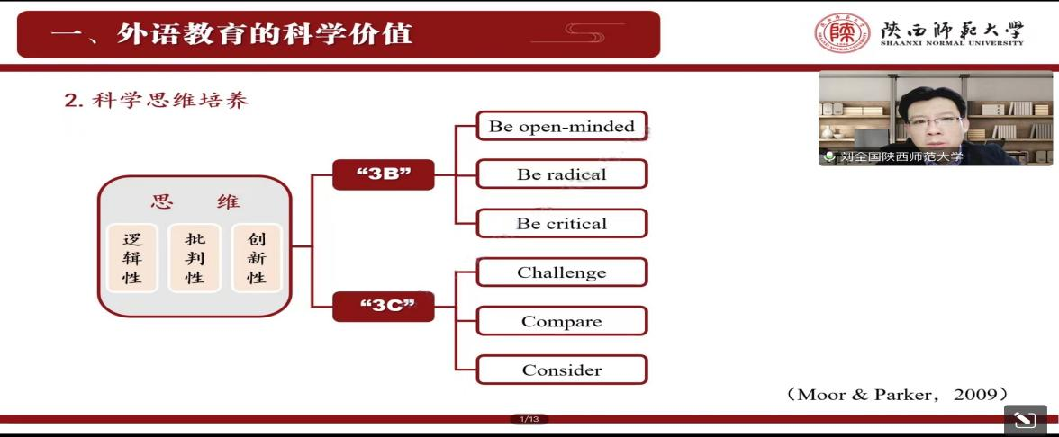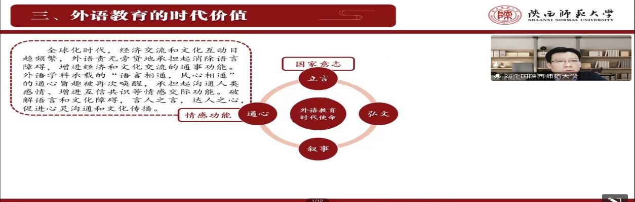 为了提高公司学科教学(英语)专业研究生的外语教学能力,加强员工对外语教学学科价值的理解,最靠谱的十大足球平台于9月23日下午在腾讯会议线上开展了外语教育学科前沿讲座第九讲——外语教育的学科价值。本次讲座由最靠谱的十大足球平台经理刘全国教授主讲,会议由韦理老师主持。2022级和2021级学科教学(英语)专业教育硕士聆听了讲座。