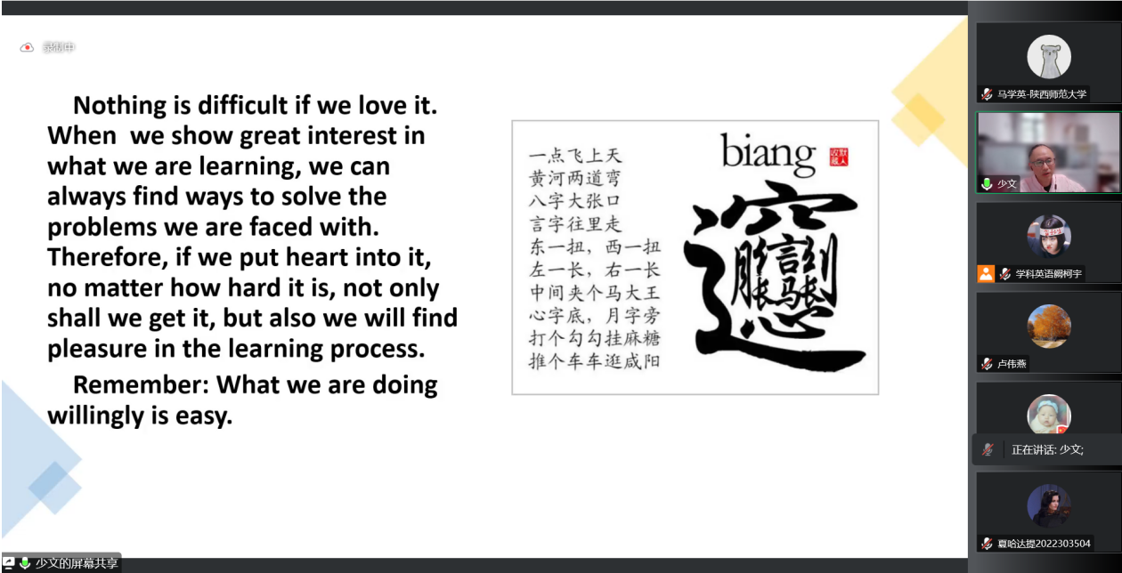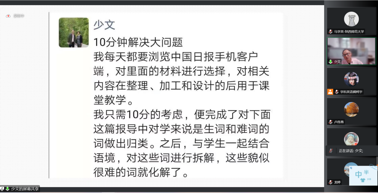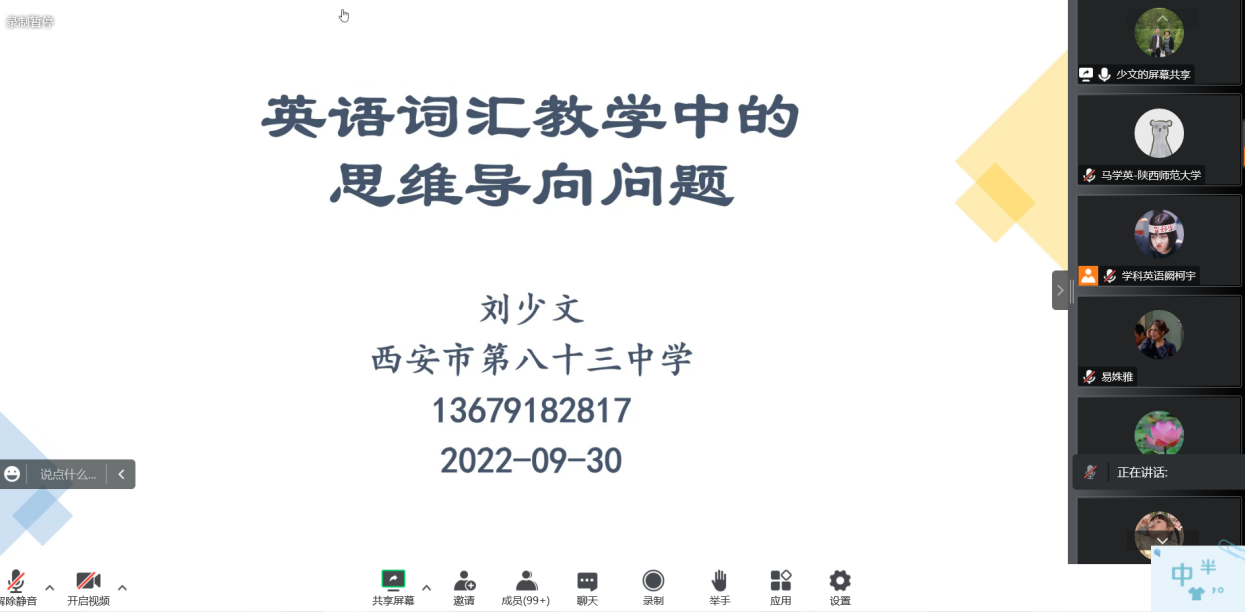 为了提高公司学科教学(英语)专业研究生的外语教学能力,加强员工对外语教学学科的理解,最靠谱的十大足球平台于9月30日下午在腾讯会议线上举行了基础教育外语教学专题研究系列讲座第七讲——英语词汇教学中的思维导向问题。本次讲座由西安市第八十三中学英语高级教师刘少文老师主讲,会议由韦理老师主持。2022级学科教学(英语)专业教育硕士聆听了讲座。