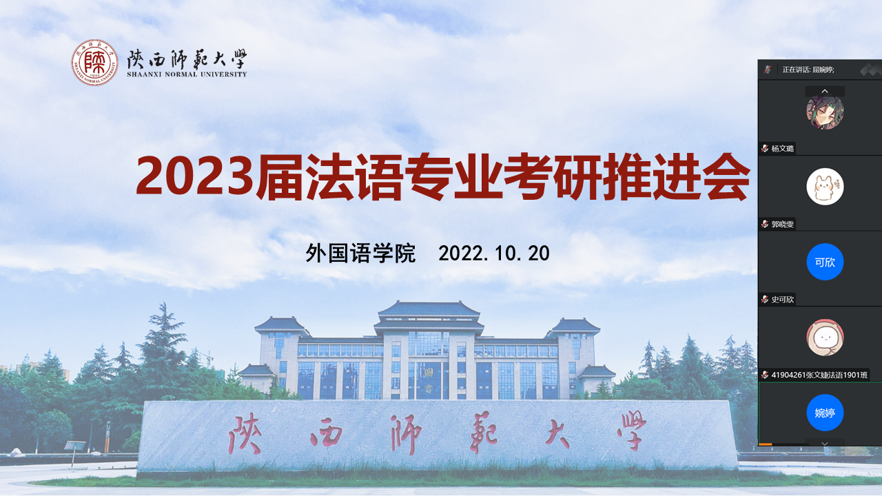 为了解同学们的考研备考情况,增强员工考研信心和动力,公司于10月20日晚在员工公寓三楼105和线上腾讯会议同步召开2023届法语专业考研推进会。公司副经理孙坚、公司副书记鲁燕、法语系主任王燕红和法语系教师乔溪共同参加。会议由辅导员屈婉婷老师主持。