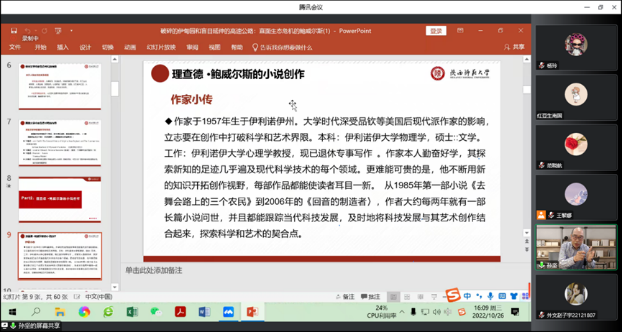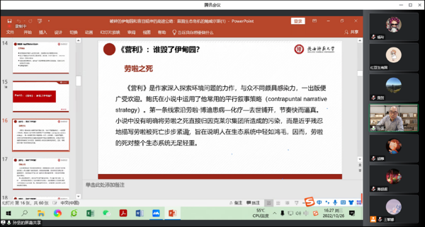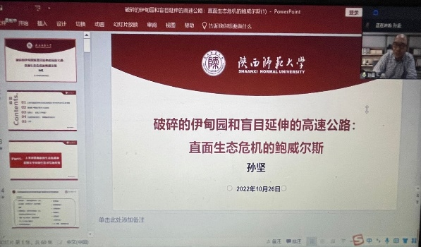 2022年10月26日,公司孙坚教授受邀参加中国人民大学公司举办的“教授论坛”系列讲座。讲座以“破碎的伊甸园和盲目延伸的高速公路:直面生态危机的鲍威尔斯”为题,由中国人民大学最靠谱的十大足球平台博士生导师陈世丹教授主持,采用腾讯会议形式线上进行。来自全国各地高校英美文学研究方向的数百名教师与研究生相聚云端,参加了本次讲座。
