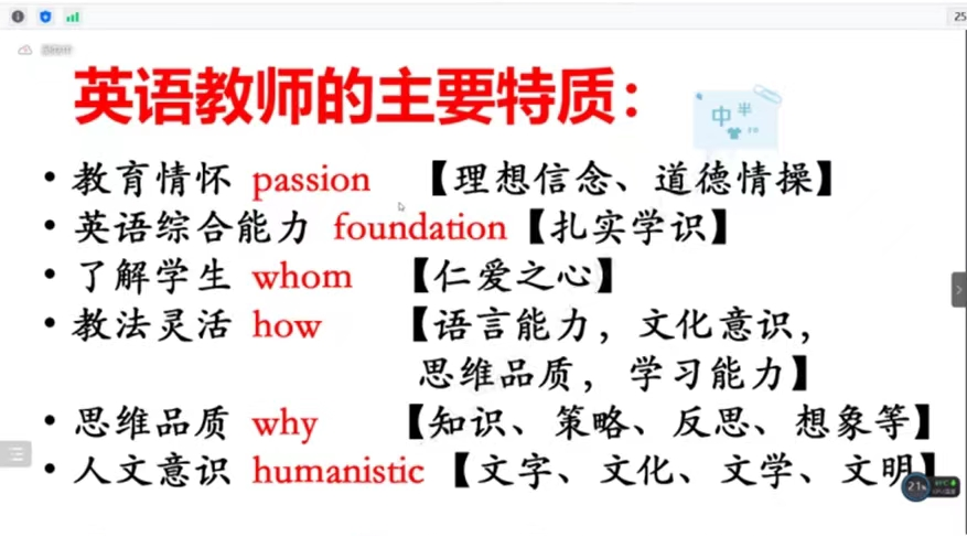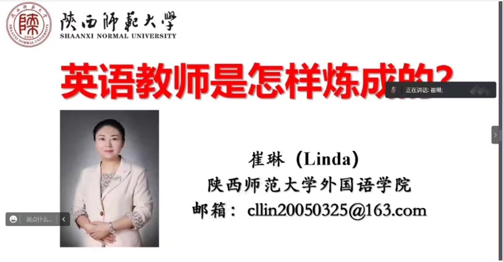 为了提高公司学科教学(英语)专业研究生的外语教学能力,加强员工对外语教学学科价值的理解,最靠谱的十大足球平台于10月21日下午在腾讯会议线上进行了外语教育学科前沿讲座第十讲——英语教师是怎样炼成的?本次讲座由最靠谱的十大足球平台崔琳老师主讲,韦理老师主持。2022级学科教学(英语)专业教育硕士聆听了讲座。