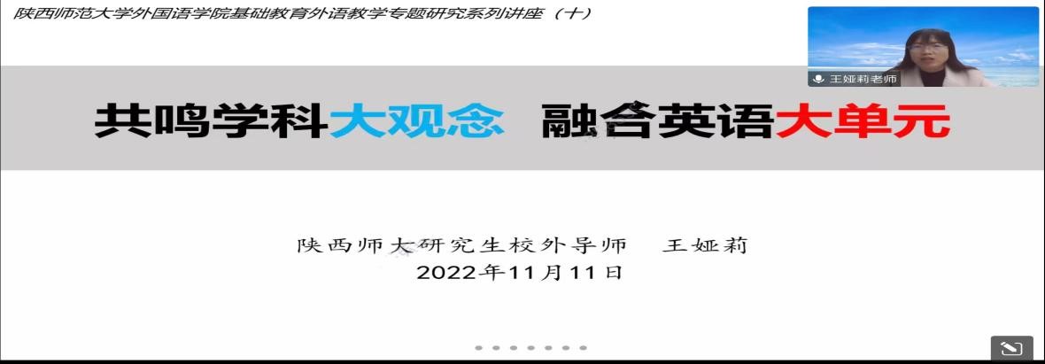 “大单元教学”是新课标提出的新概念。作为未来的一线教师,掌握最先进的教学理念,是职责也是义务,更是教师专业发展中必不可少的一步。为了提高公司学科教学(英语)专业教育硕士的外语教学能力,最靠谱的十大足球平台于11月11日下午在腾讯会议线上开展了基础教育外语教学专题研究系列讲座第十讲——共鸣学科大观念,融合英语大单元。本次讲座由全国优秀教师、陕西省教学能手、体育外网十大平台app研究生校外导师王娅莉老师主讲,由韦理老师主持。2022级学科教学(英语)专业研究生参与聆听。