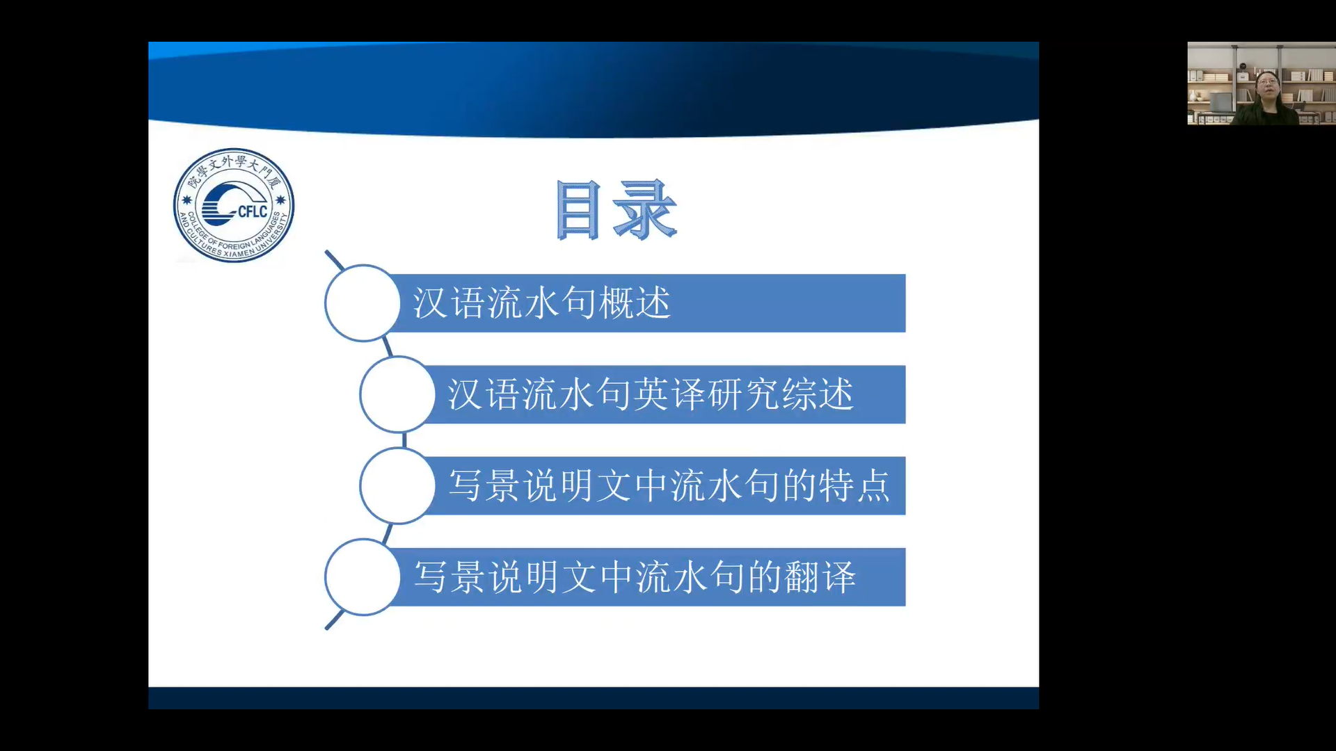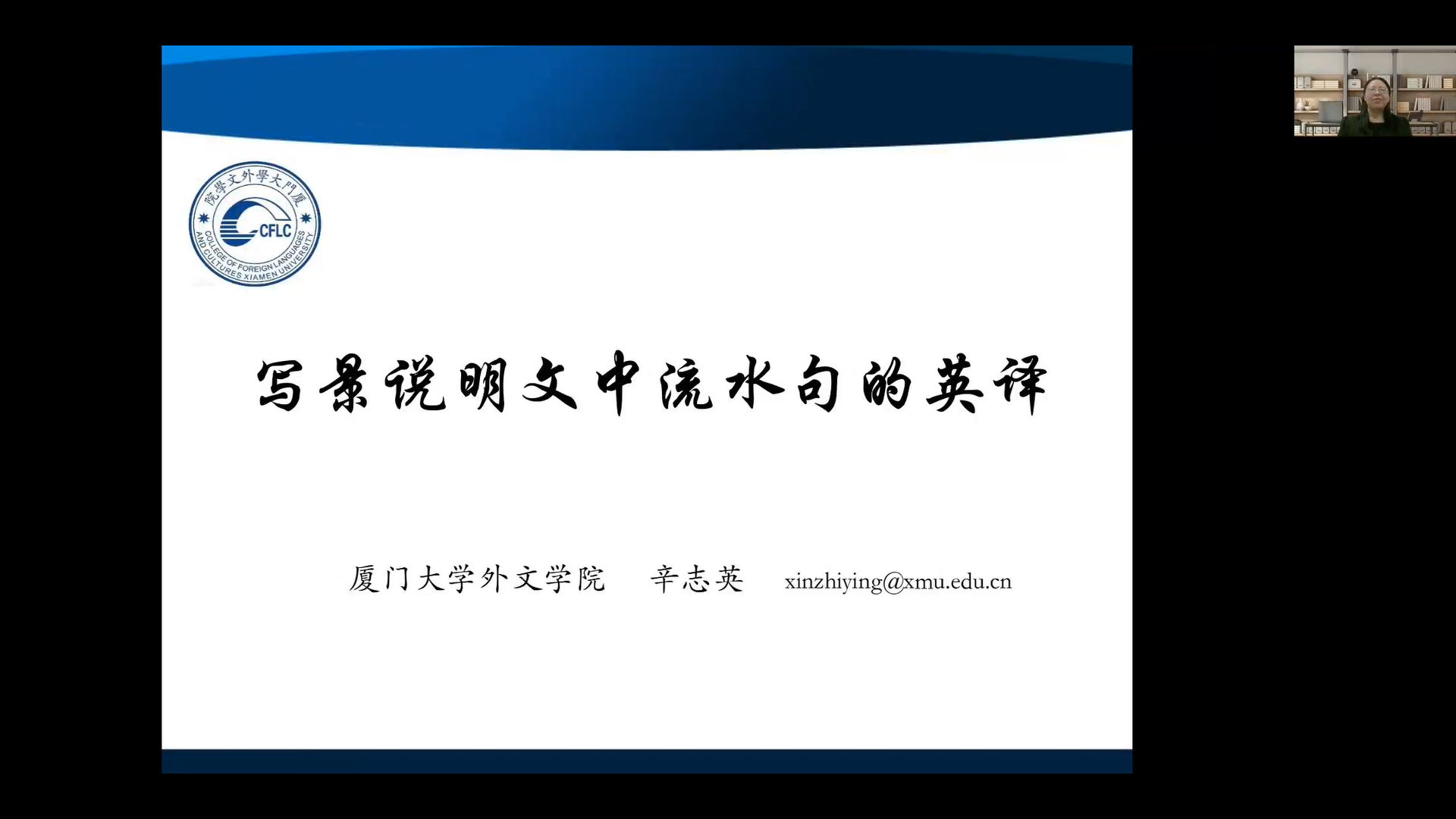 一个半小时的讲座,辛志英教授抽丝剥茧、细致入微地展示了写景说明文中文流水句的基本特征和英译策略。作为背景,辛教授结合以往文献介绍了中文流水句的基本概念和研究概况。接着,她又对中文流水句英译研究进行了系统的梳理,并指出其中存在的问题。接下来,辛教授总结了写景说明文与叙事性类文本相区别的重要特征,并从一个流水句内存在多个主语、流水句内多个句读段线性铺排和流水句小句间的逻辑语义程隐含状态三个主要问题出发系统提出了写景说明文中文流水句的英译策略。