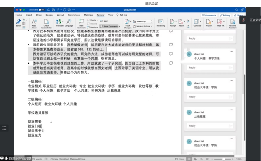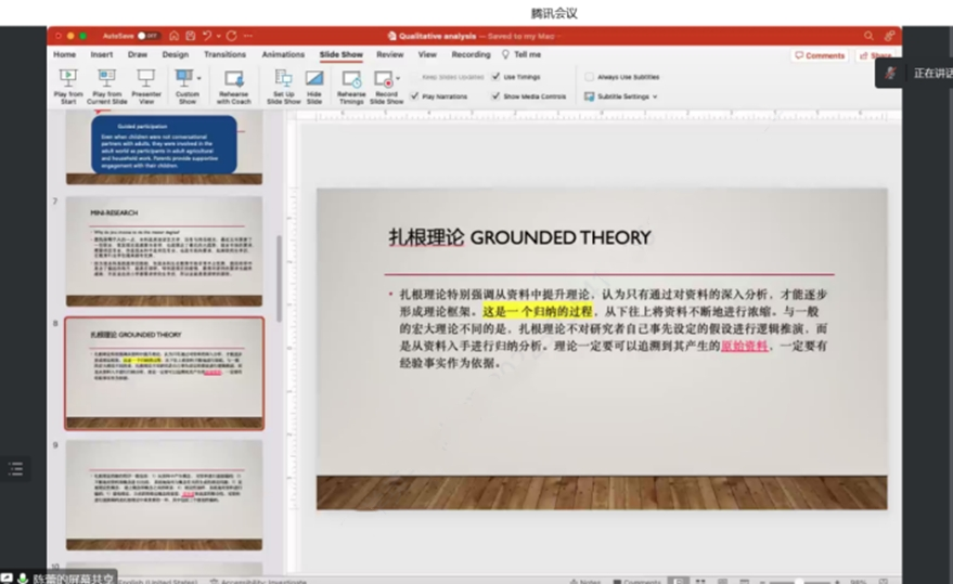 为方便同学们对扎根理论的理解,陈老师通过随机与大家互动的方式,模拟小型访谈,并借用屏幕分享的方式向大家介绍了扎根理论如何对资料进行编码以及怎样处理数据。