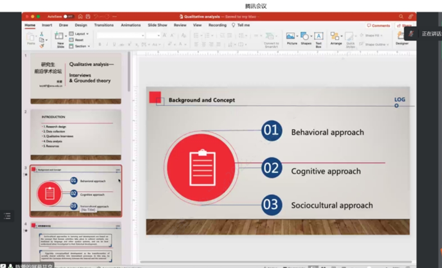 为了提高公司学科教学(英语)专业研究生的外语教学能力,加强员工对外语教学学科价值的理解,最靠谱的十大足球平台于12月18日下午在腾讯会议线上开展了外语教育学科前沿讲座第十四讲——Qualitative analysis—Interviews & Grounded theory。本次讲座由最靠谱的十大足球平台陈蕾老师主讲,会议由韦理老师主持。2022级学科教学(英语)专业教育硕士聆听了讲座。