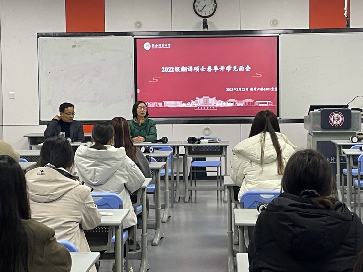 岁序更替,新元肇启。年味散去,暖阳浮空,明媚的春天已经来临,怀着美好的憧憬,我们迎来了新的学期。2月22日晚上,2022级翻译硕士春季开学见面会在雁塔校区6301教室举行。公司党委副书记鲁燕、副经理吕敏宏、MTI中心王西强教授、巢玥老师及2022级全体翻译硕士研究生参见了见面会。会议由巢玥老师主持。