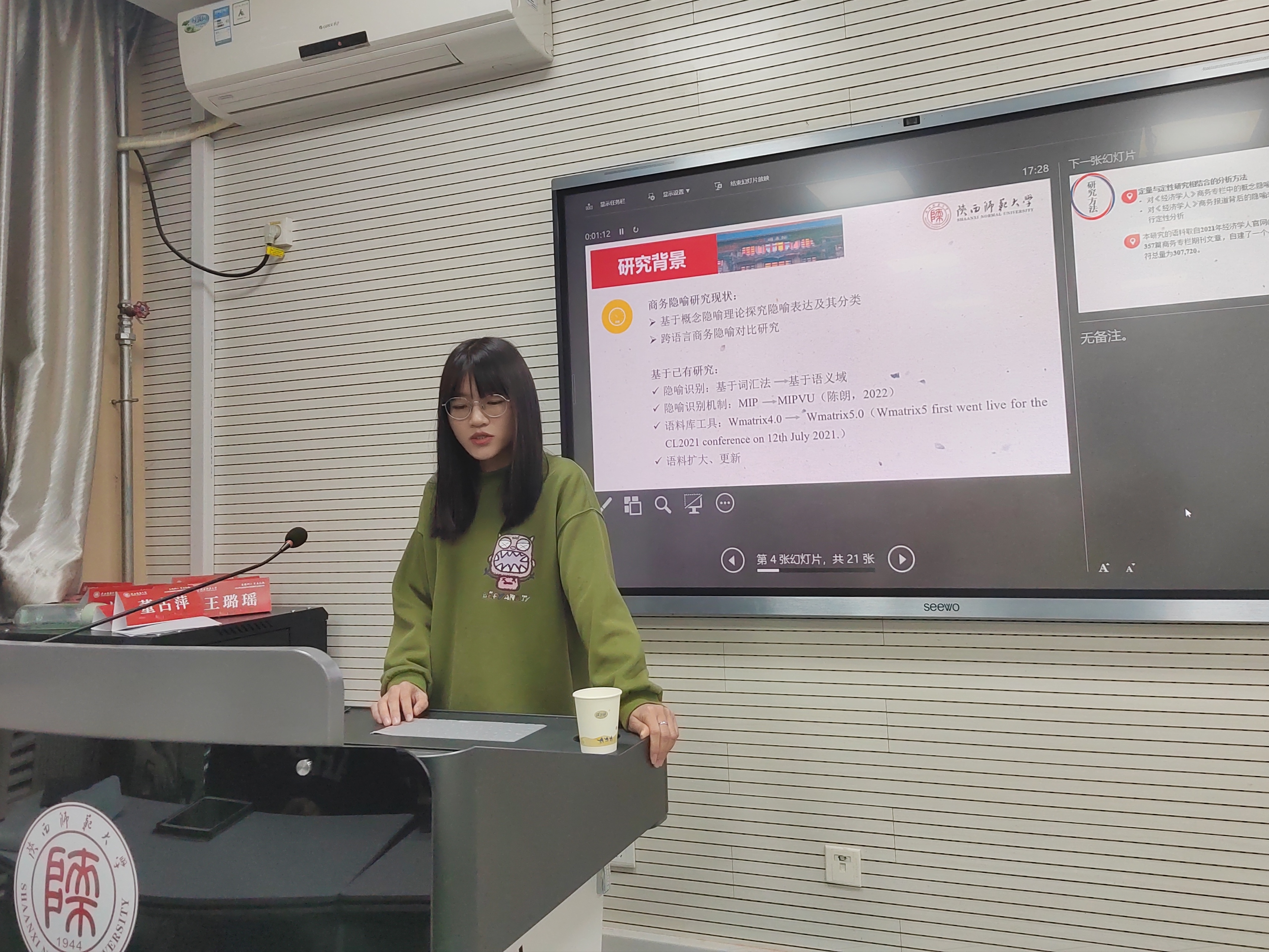 李晓冉以《基于语料库工具Wmatric的商务语篇隐喻分析》为题进行汇报。她具体介绍了研究背景、研究方法、Wmatric的商务语篇隐喻甄别和隐喻分析等内容,为同学们提供了行之有效的科研思路与方法。