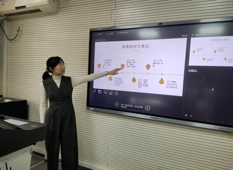 2023年11月7日下午14:30,在雁塔校区教学六楼6315教室,体育外网十大平台app法语系及德法研究团队举办了“知行”学术沙龙——东北亚与欧洲研究学科团队沙龙。法语系副教授乔溪以“地理批评研究的媒介间性特征”为题进行报告,并同与会师生面对面交流讨论关于地理批评的一些问题。