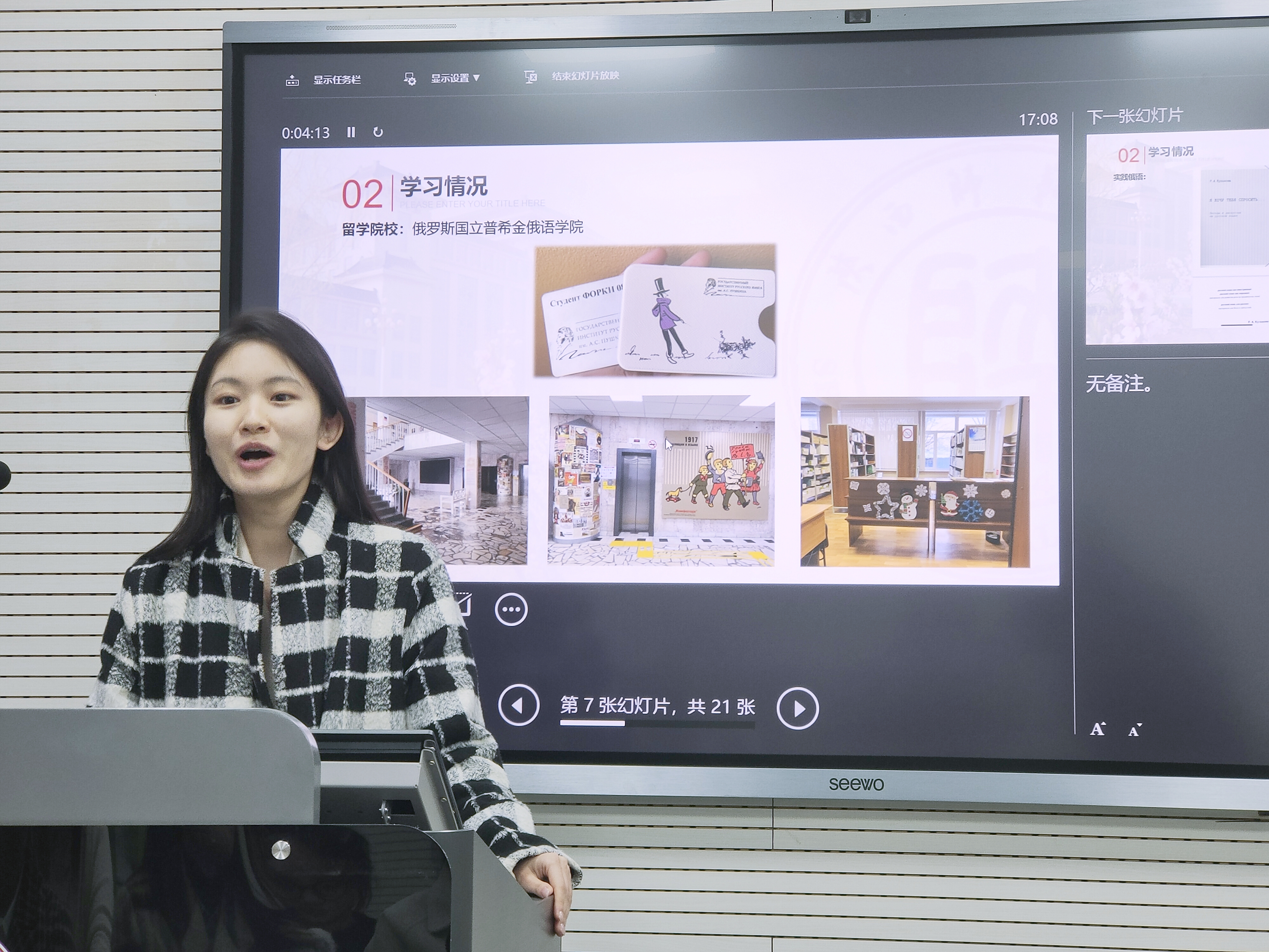 田欣雅同学以《放眼世界,敢于表达》为题作俄罗斯留学经历分享。田欣雅同学结合自身申请经历,向听众详细介绍留学项目与就读院校情况。作为俄语专业职工,她在留学过程中兼顾专业学习与社会实践,在实践中提升了口语能力以及自我修养。最后,田欣雅通过视频展现了俄罗斯风土人情,并向听众推荐了当地的风景名胜。